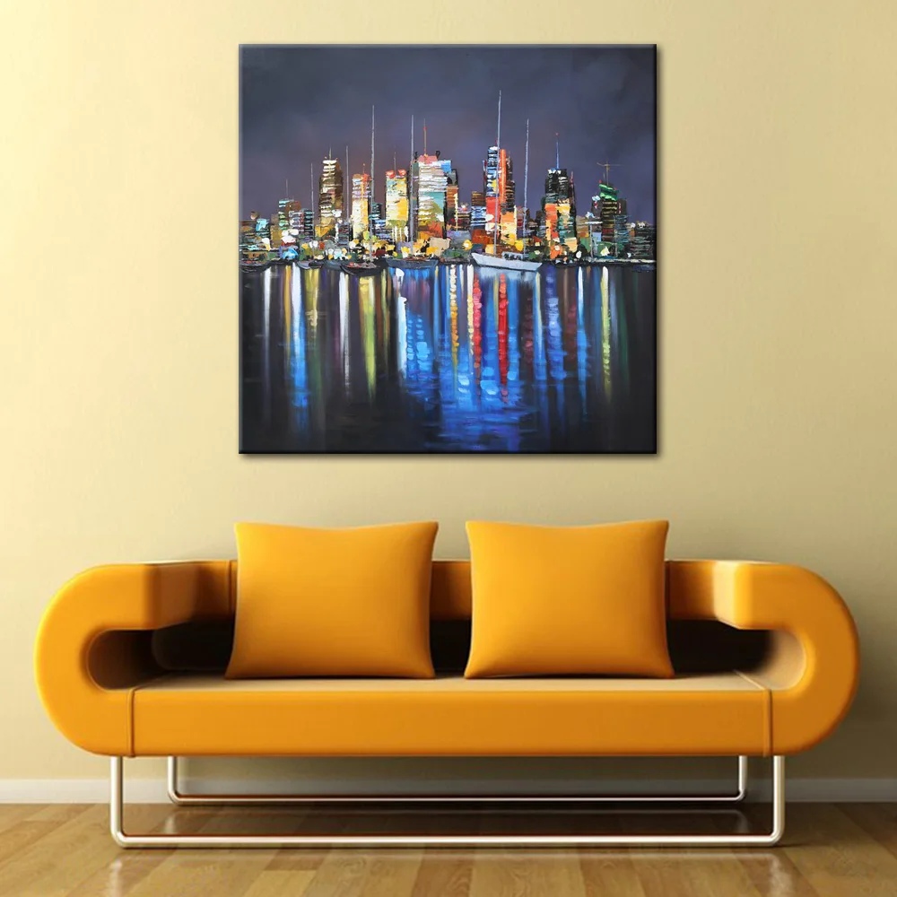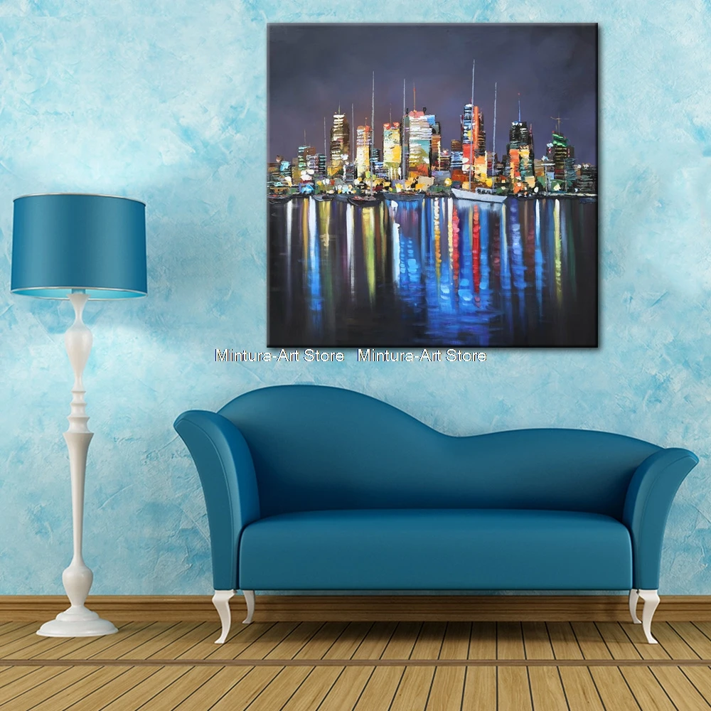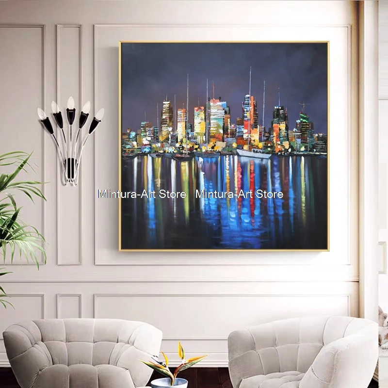 Картина без рамы, абстрактный пейзаж, ночной вид Нью-Йорка на реке, картины маслом на холсте, Современный домашний декор для спальни, гостиной