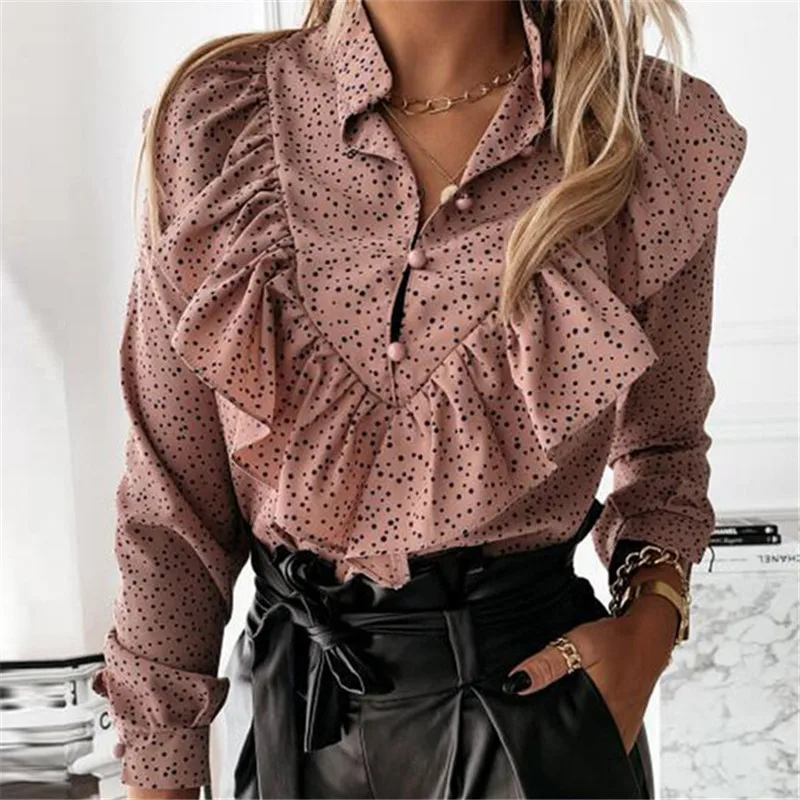 Блузка с оборками в горошек, винтажная рубашка с длинным рукавом, элегантный офисный топ с V-образным вырезом, размера плюс, Осень-зима 2020