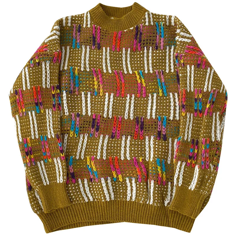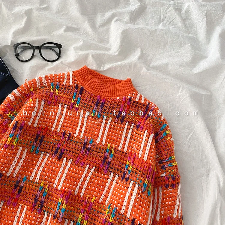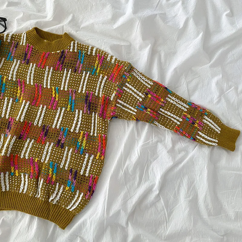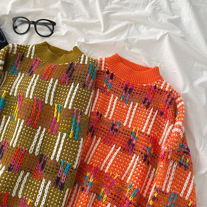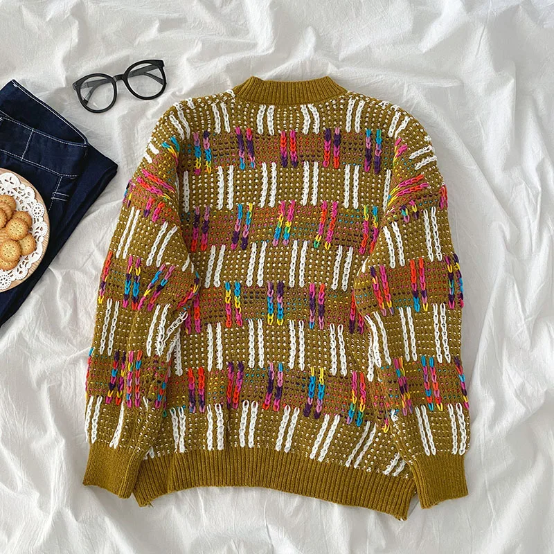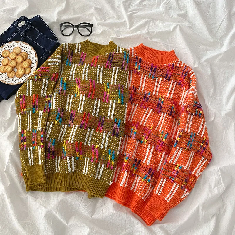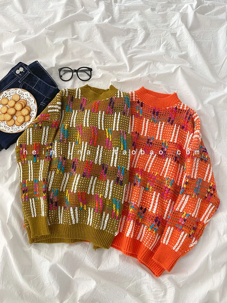 Новый женский цветной жаккардовый свитер, корейский Свободный пуловер с длинным рукавом, Модные женские свободные вязаные свитера