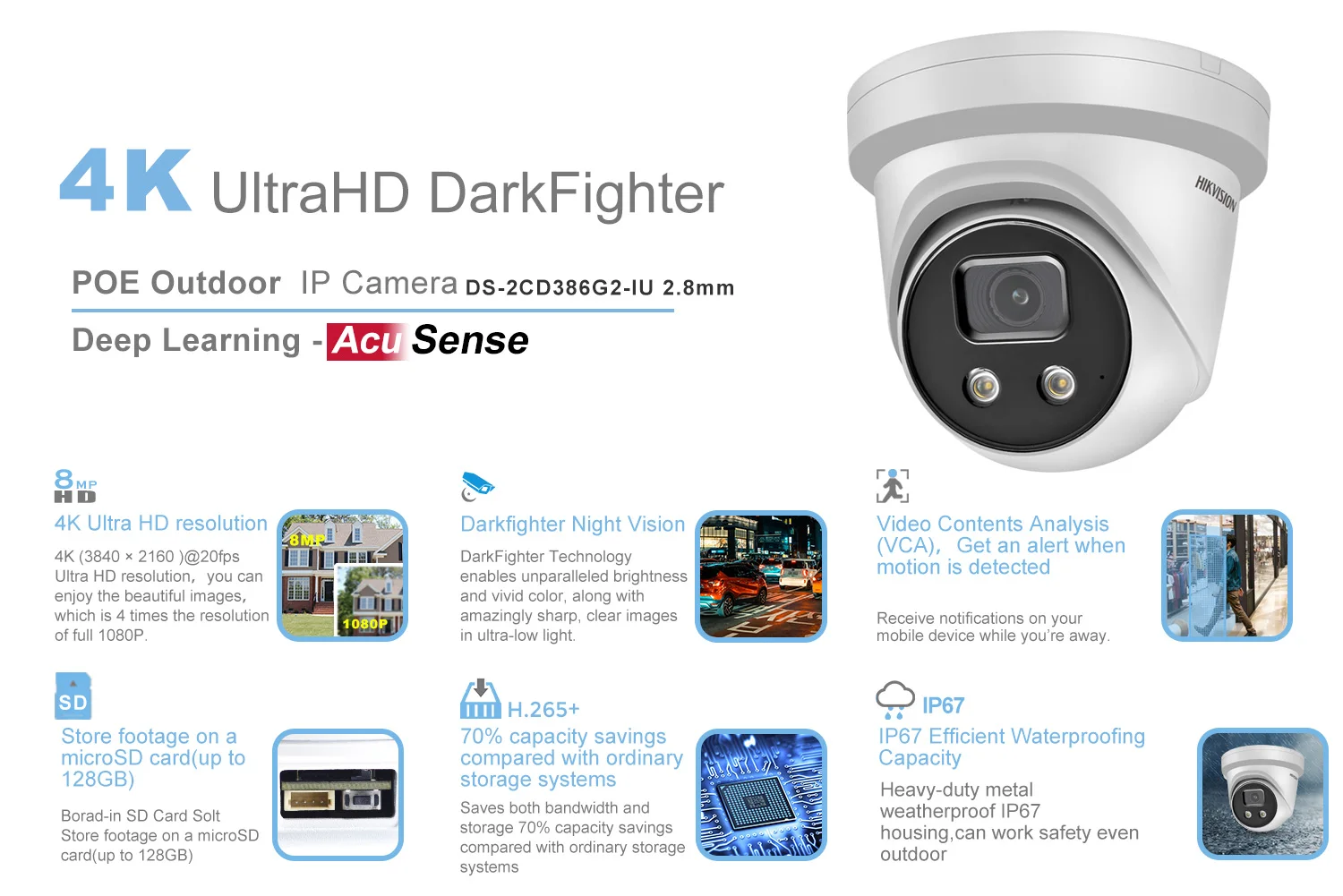 IP-камера Hikvision 8 Мп, 4K POE AcuSense, оригинальная DS-2CD2386G2-IU H.265 + DarkFighter IP67 IR 30 м, купольная сетевая камера