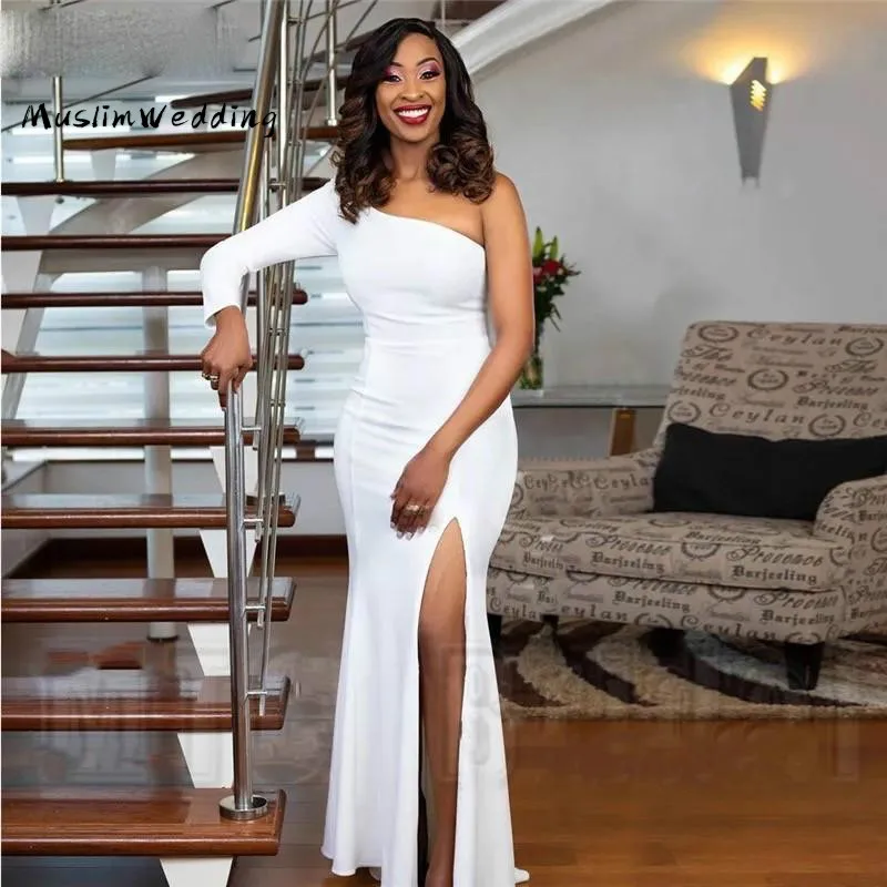 Простое белое вечернее платье на одно плечо с длинным рукавом и разрезом сбоку, платья для выпускного вечера русалки 2020, дешевое Элегантное Длинное торжественное платье в африканском стиле