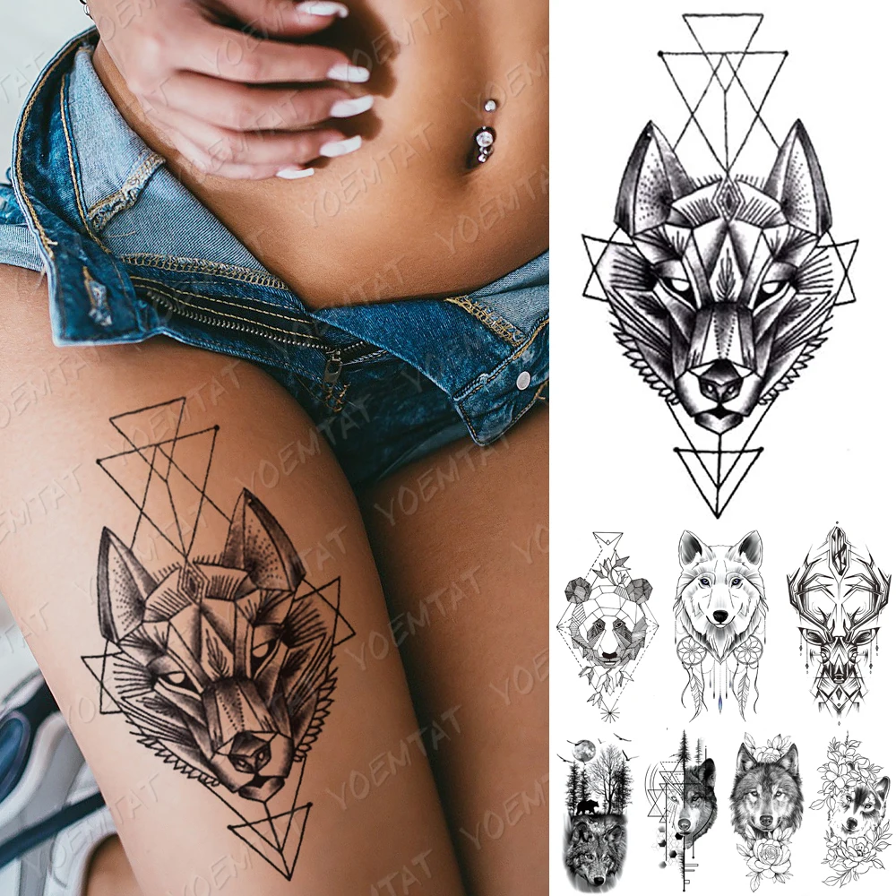 трафареты для тату для женщин и мужчин наклейки переводные переводные татуировки Водостойкая Временная тату-наклейка, линия, геометрия, лиса, панда, искусственный олень, цветы, боди-арт, рука, искусственный рукав,
