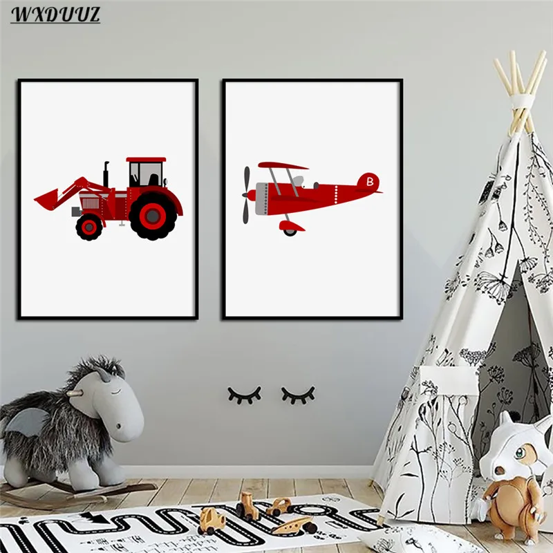 Мультяшный самолет бульдозер пожарная машина Искусство Декор Картина для детской комнаты настенный Декор качественная Картина на холсте плакат домашний декор