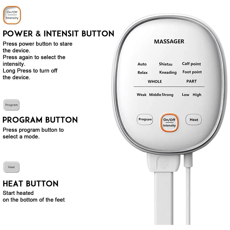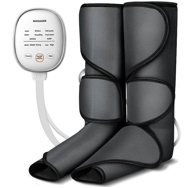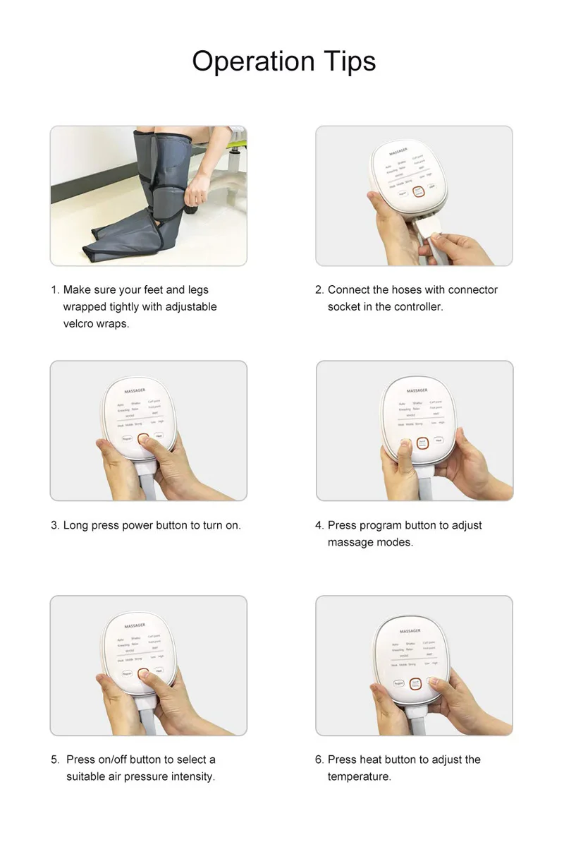 Массажер для ног и ступней-Этот массажер для ног имеет 2x3 воздушных мешка внутри, обеспечивает циклический массаж икр и ступней, прижимает ступню и икроножную мышцу от нижней до верхней. Отлично подходит для ослабления напряженных мышц, улучшения кровообращения, снятия усталости, устранения отеков.6 режимов массажа и 3 режима интенсивности-легко Управляйте массажером с помощью портативного контроллера, 6 режимов массажа, 3 режима интенсивности и 2 температуры доступны в 36 техниках массажа для обеспечения различных ощущений от массажа. Безопасное питание от адаптера DC12V/2A (UL штекер), функция автоматического отключения за 10 минут.Регулируемые обертывания для ног-массажер для ног поставляется с 2 обертываниями для ног, которые изготовлены из мягкой ткани и удобны, гибкие для прочной и удобной посадки. Устройство последовательного сжатия можно регулировать, вы можете регулировать плотность икр с помощью липучки, длина по периметру икры может достигать макс. 22 дюйма.Успокаивающая Функция нагрева на ногах-Массажер имеет функцию низкого и высокого нагрева под подошвами, нагревательный массаж может согреть ваши ноги, чтобы быстрее расслабиться и успокаивать, имеет более комфортные и прекрасные ощущения от массажаЛучший подарок для любимого человека-хороший Массажер для домашнего использования или подарки от ноги до бедра, он будет отличным подарком для членов вашей семьи, друзей, родственников.