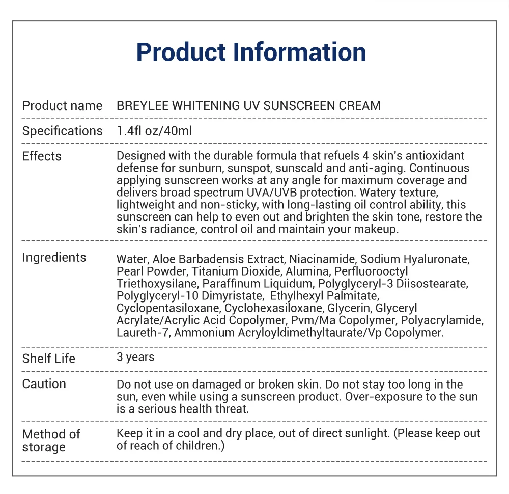 Отбеливающий УФ-крем BREYLEE SPF50, солнцезащитный крем, PA +++, увлажняющий, антивозрастной, для контроля жирности, уменьшающий меланин, уход за кожей, 40 мл