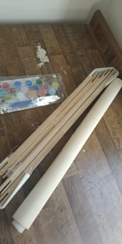 Картина пришла без подрамника. Холст в рулоне. Картинка-образец маленькая и крупнозернистая. В комплекте пришли три кисточки и крючок для подрамника, которого нет ))) это улыбнуло. Качество красок пока оценить не могу, так как не пробовала. Посылка шла около месяца.