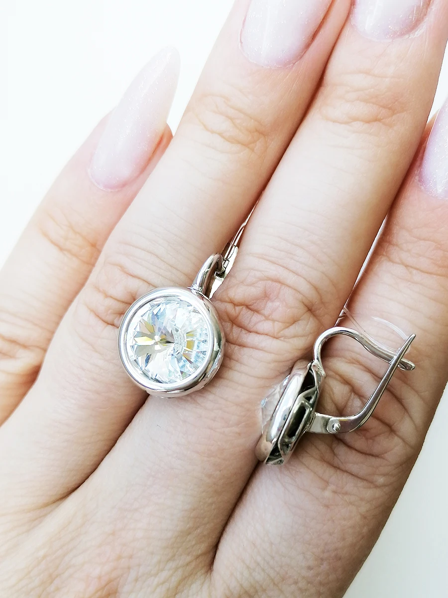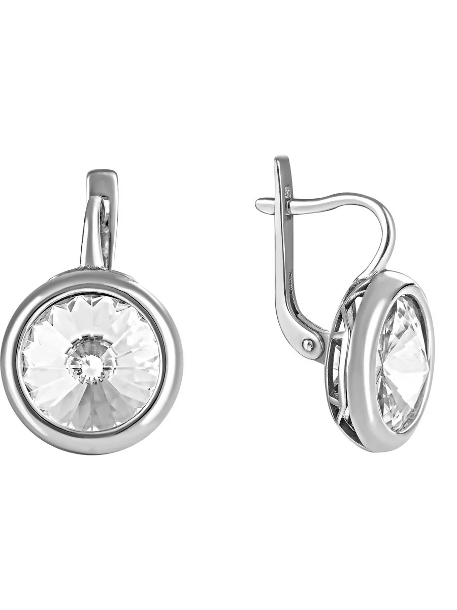 Серьги выполнены из серебра 925 пробы. Покрытие родирование. Вставка кристалл 12мм. Длина серьги общая 25мм. Рабочая зона штифта 8мм.