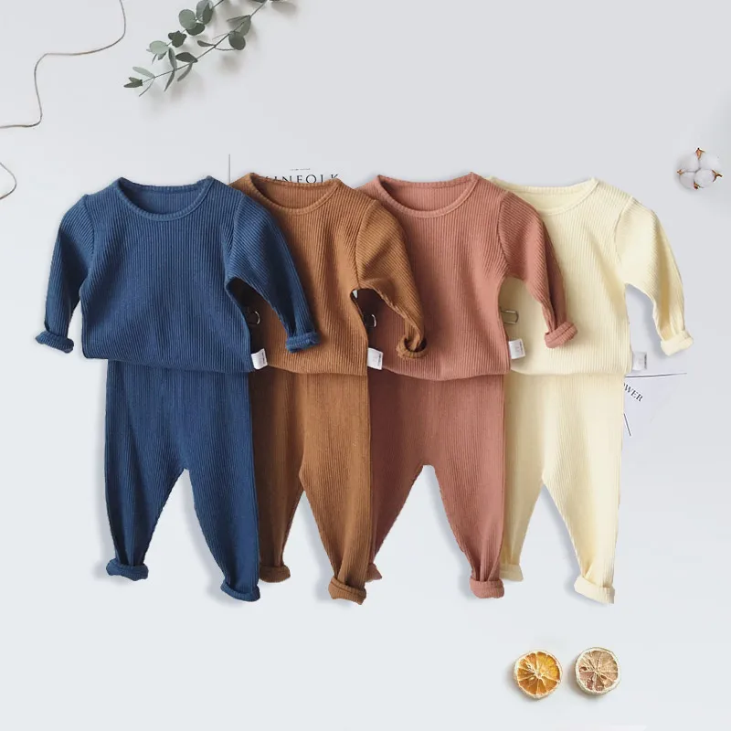 Весенне-осенне-зимний хлопковый комплект одежды для мальчиков и девочек, рубашка в рубчик + штаны, одежда для отдыха для малышей