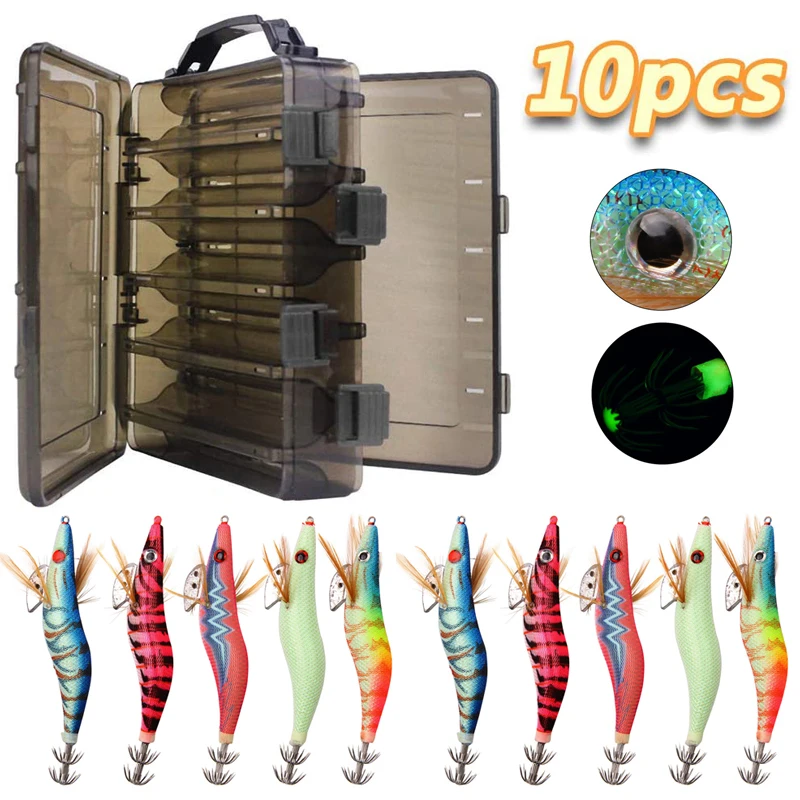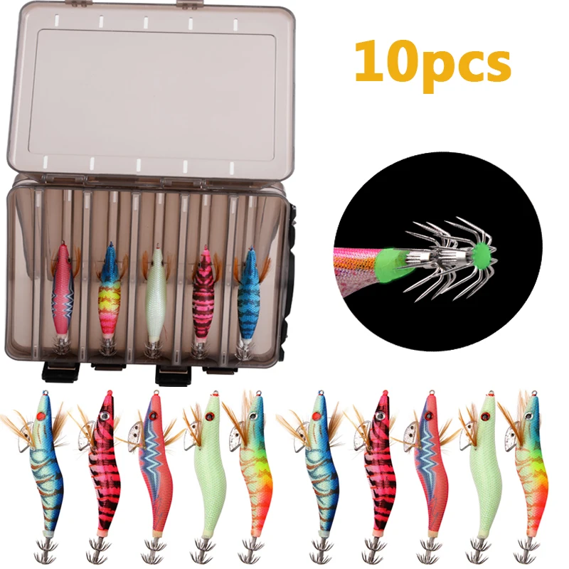 10 шт.коркор. рыболовные крючки для приманки для кальмара, деревянные рыболовные крючки для креветок, пластиковые приманки в пластиковой коробке