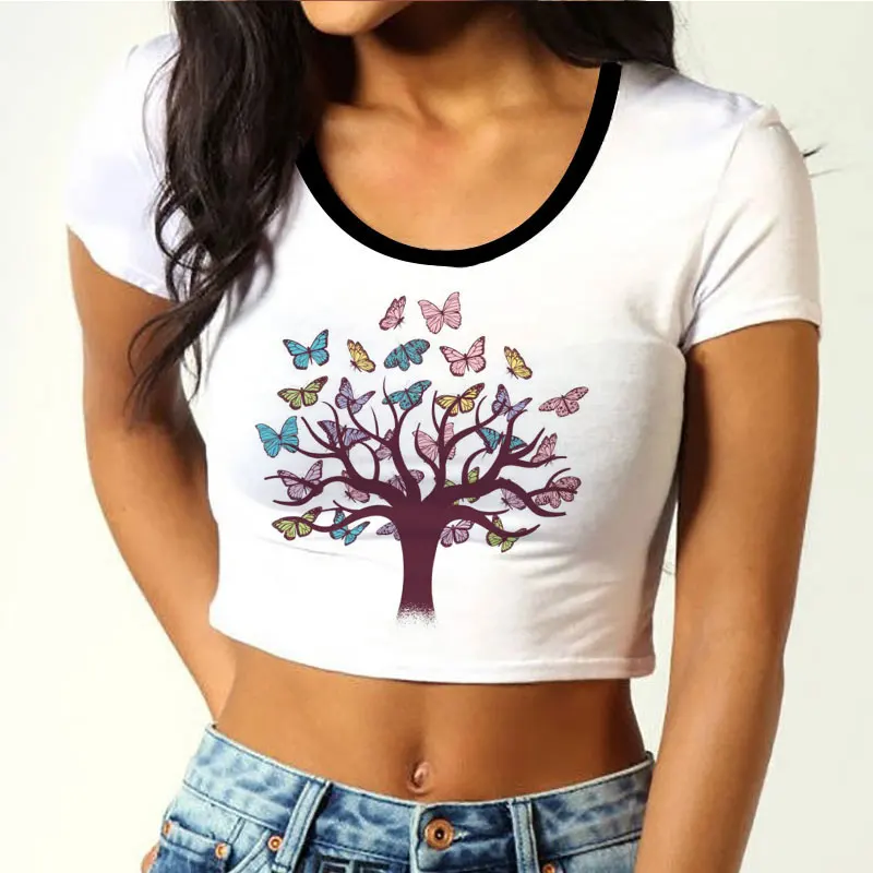 Женская эстетичная футболка в стиле Харадзюку, женские укороченные топы с коротким рукавом и принтом бабочки и дерева, женская футболка, модные сексуальные футболки, Прямая поставка