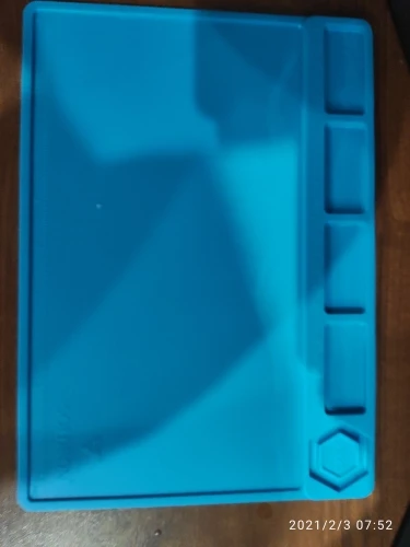 Заказ пришёл довольно быстро. Только упаковка повреждена, подозреваю, что из посылки вытащили какой-то другой заказ... Очень хороший коврик. Всё надписи отлиты качественно, есть 4 магнита, мягкий, на морозе не дубеет. Осталось дождаться паяльную станцию.
