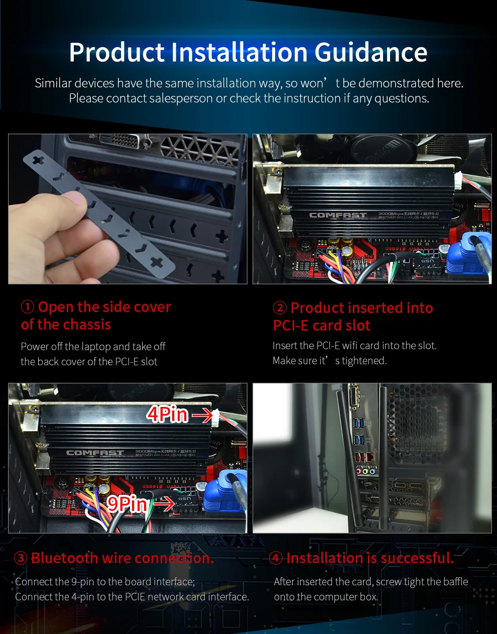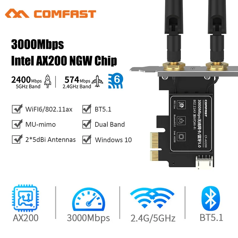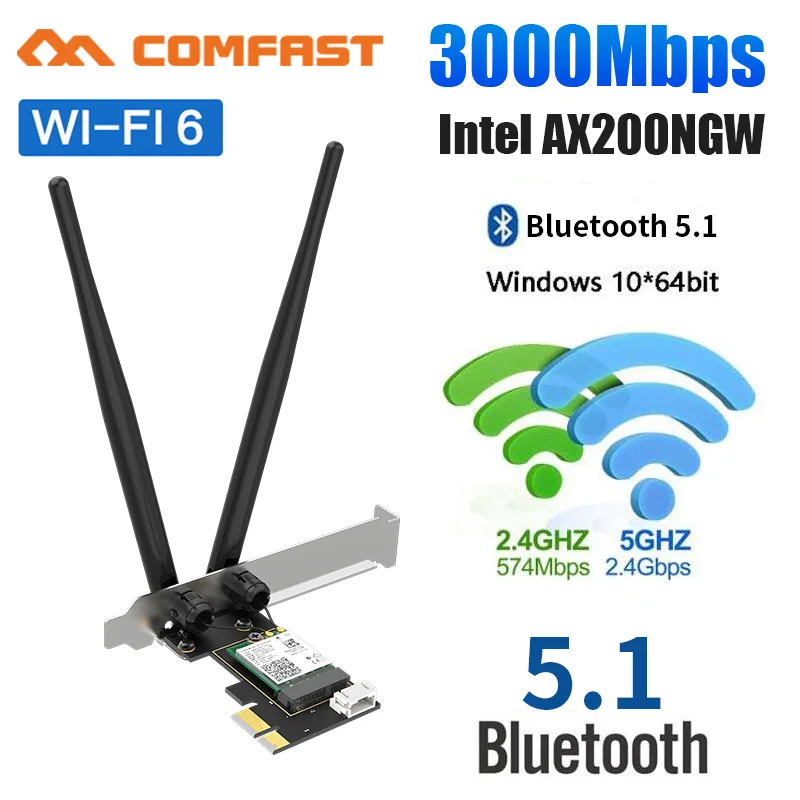 Сетевая карта Wi-Fi 6, 3000 Мбитс, Двухдиапазонная, 802 ГГц5 ГГц, Intel AX 2,4, PCI Express, Wi-Fi, Bluetooth 200, адаптер