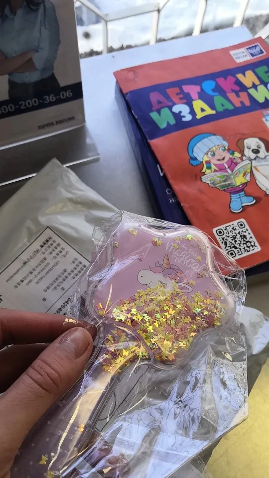 Хорошая, обычная, глянцевая, блестит, без царапин и повреждений, нежная, блестяшки просто так сыпятся внутри сухие (без жидкости), Очень понравилась. Щетинки приятные, в меру мягкие и эластичные. Дошла очень быстро, за 2 недели до СПб. Упакована в пакет +полиэтилен с пупырками + серый стандартный пакет.