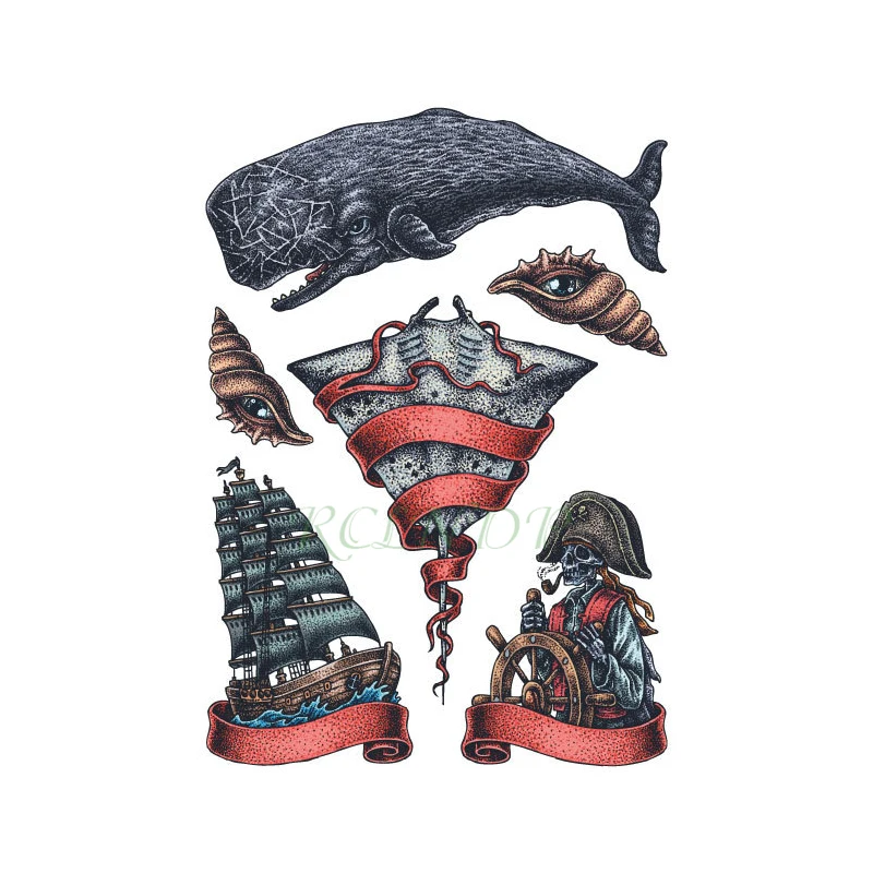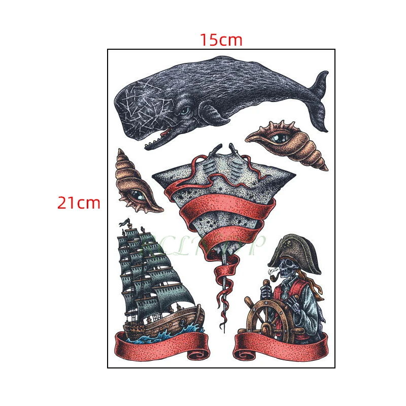 Водостойкая временная татуировка-наклейка, пиратский корабль, Акула, дьявол, рыба, улитка, флэш-тату