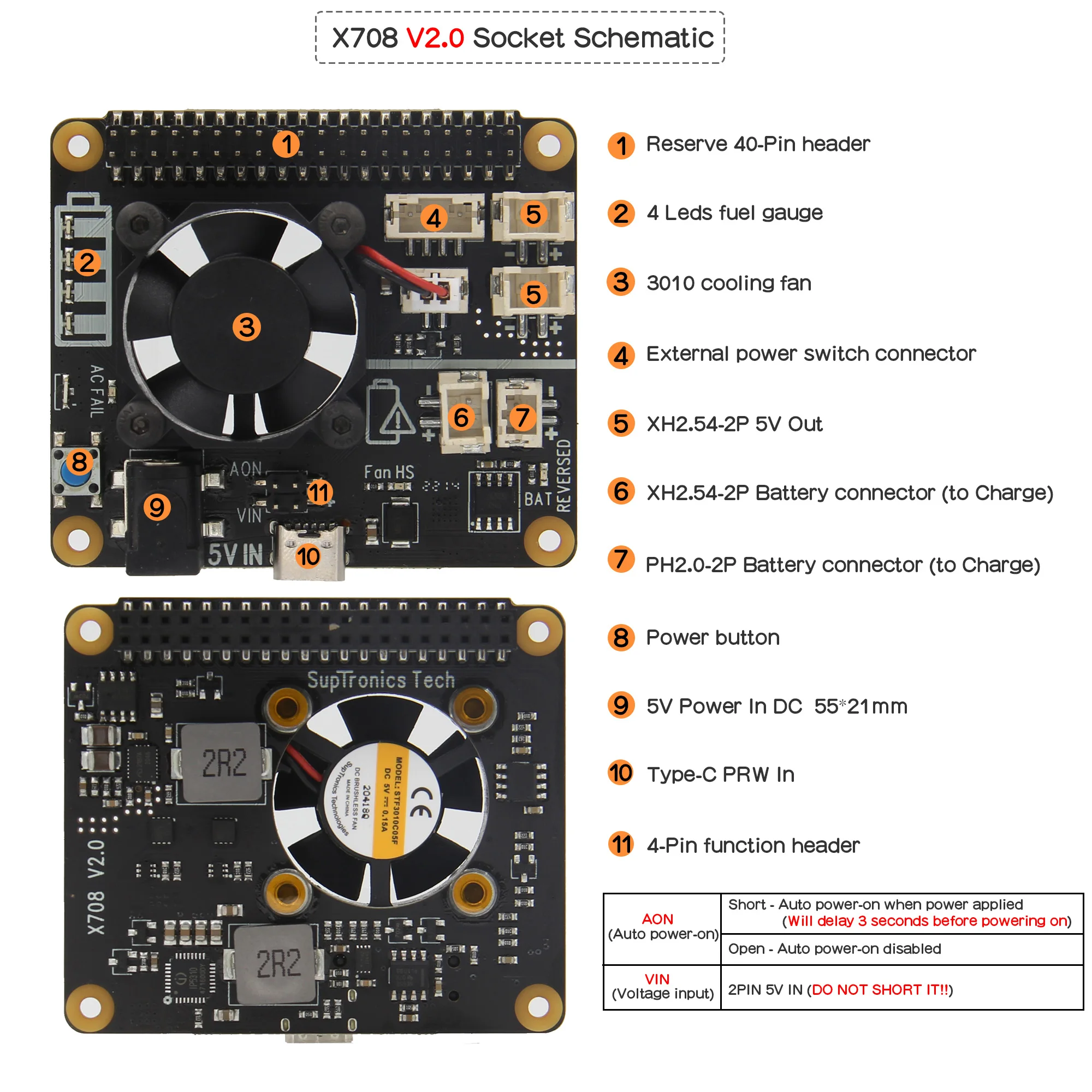 В X708 является передовым источник бесперебойного электроснабжения от источника питания плата расширения для всех текущих моделей Raspberry Pi с помощью 40 штыревой разъём. Это обеспечивает 5,1 V Макс. Резервное копирование мощности 8000mA даже для самых требовательных Raspberry Pi комплектов ups, интеллектуальное и безопасное управление питанием, безопасное отключение, потеря мощности переменного тока/Обнаружение сбоя адаптера питания, автоматическое включение питания, полное отключение от программного обеспечения и охлаждающий вентилятор