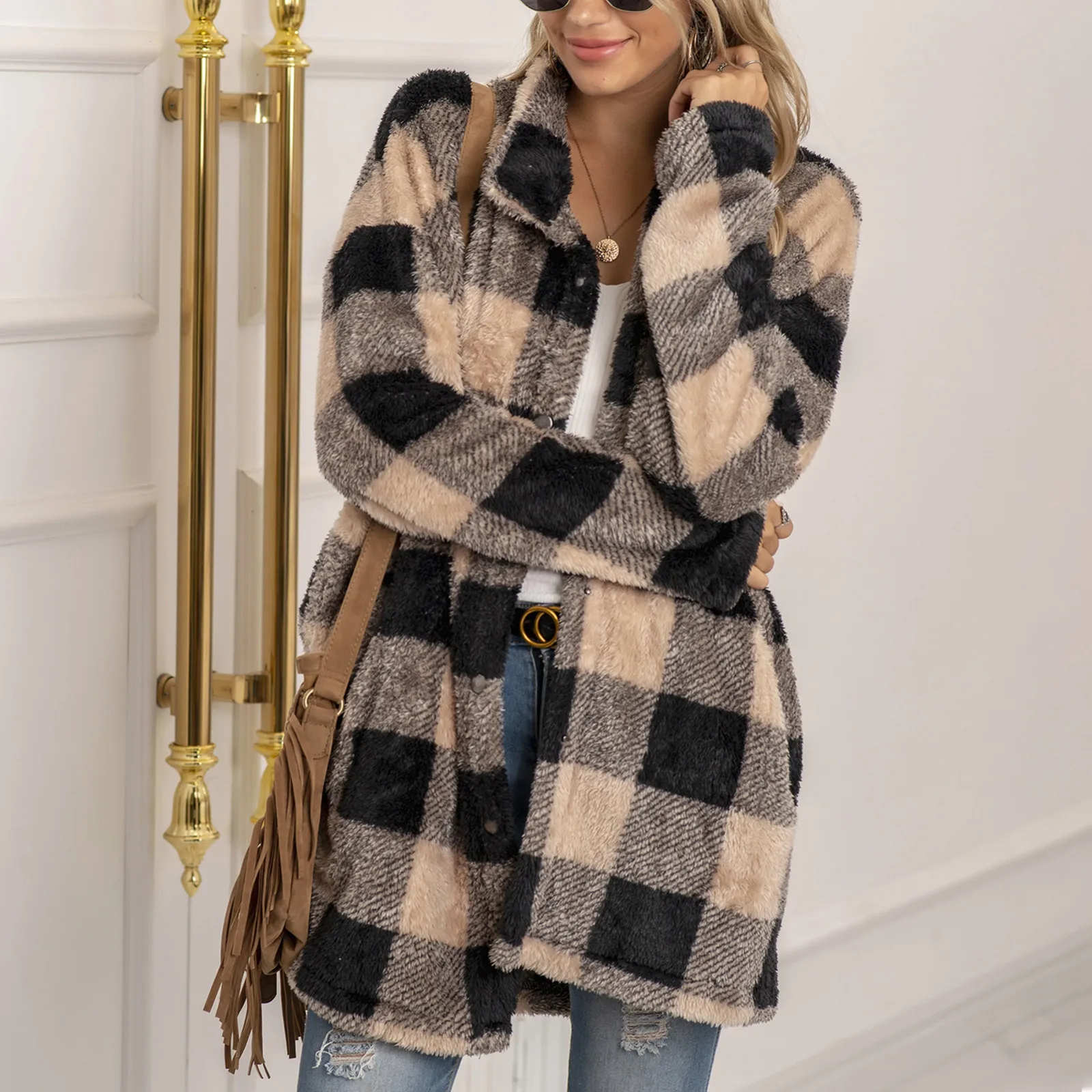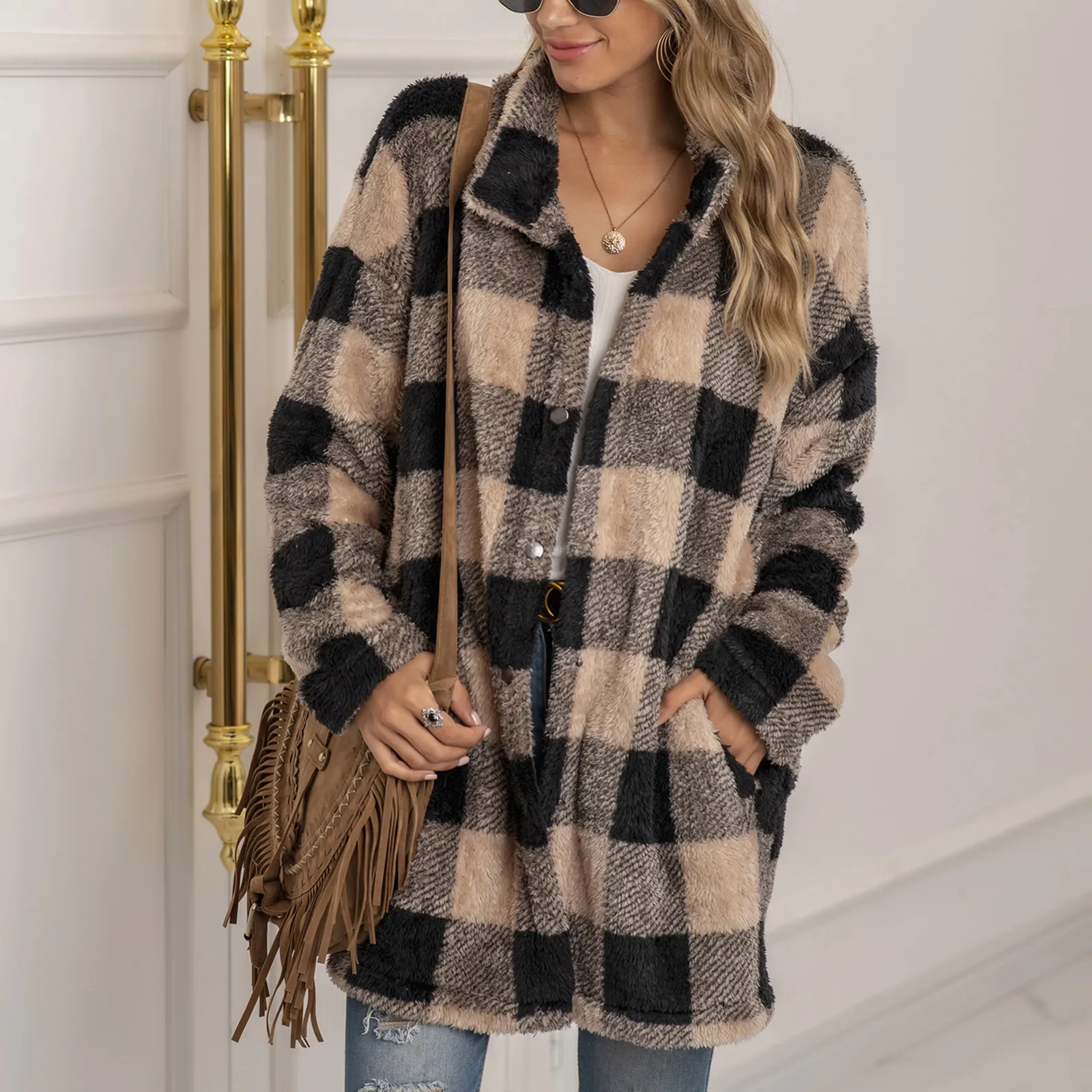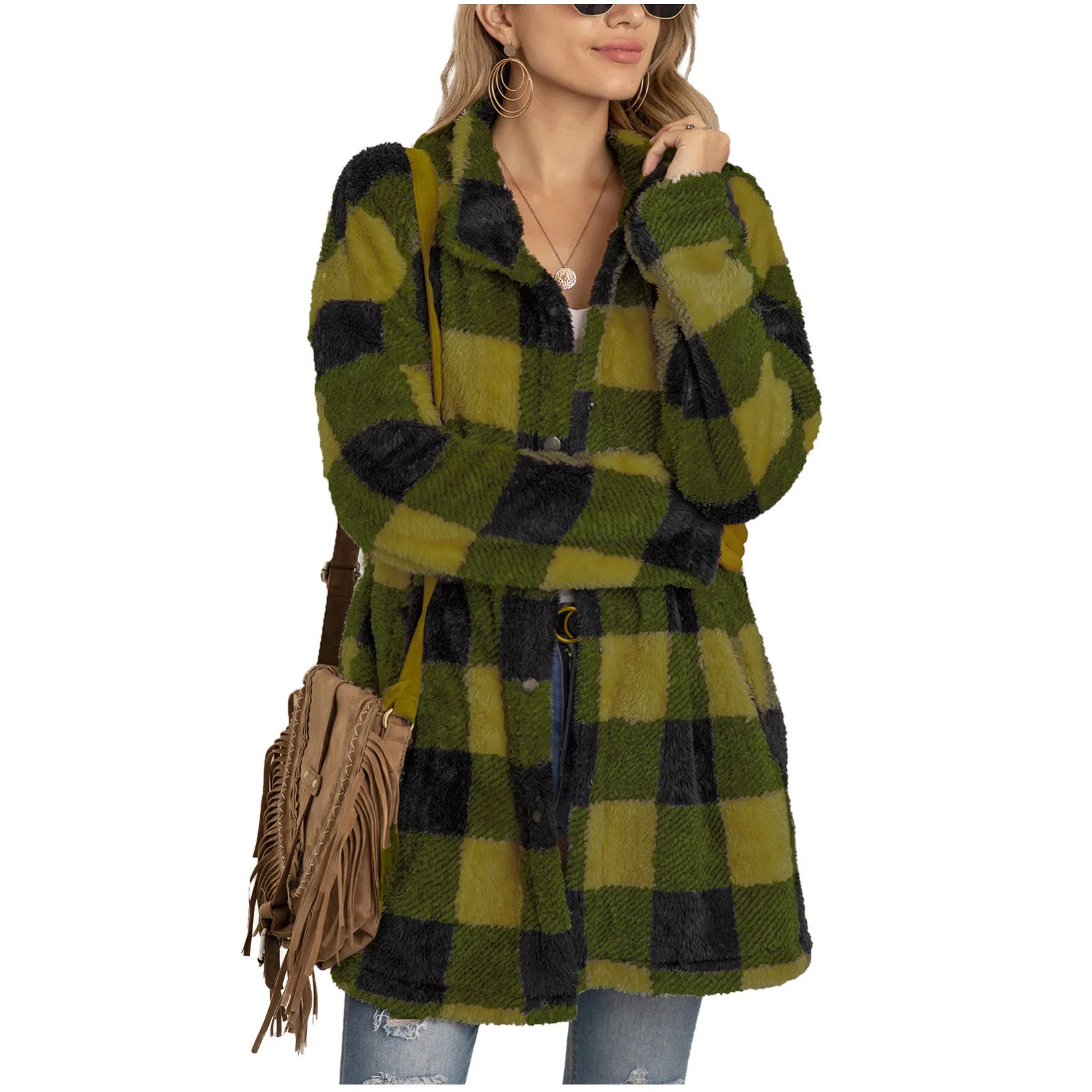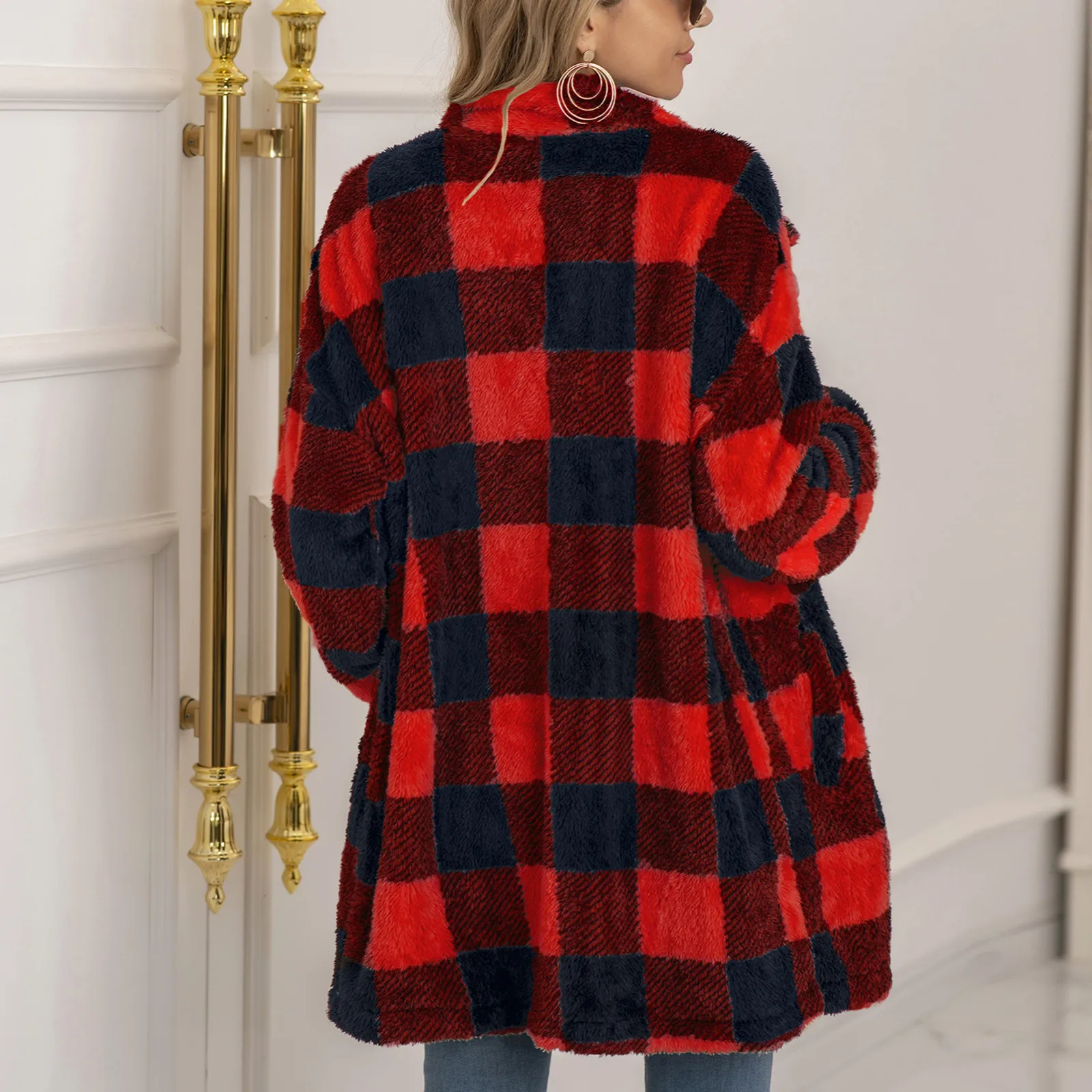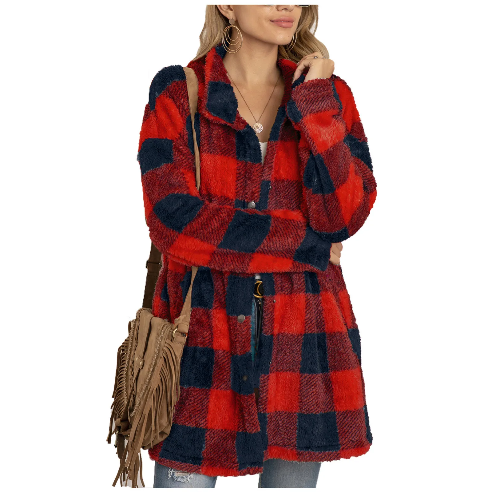 Женское повседневное плотное пальто в клетку, осенне-зимняя теплая куртка, рождественское плюшевое пальто в клетку с длинным рукавом и пуговицами, # j5s