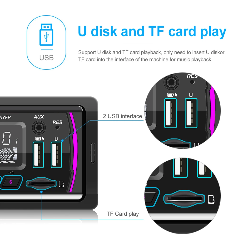 6. Воспроизведение u-диска/AUX: поддержка u-диска для воспроизведения, вам нужно только вставить u-диск в интерфейс машины для воспроизведения музыки, Поддержка внешнего входа AUX (plug)