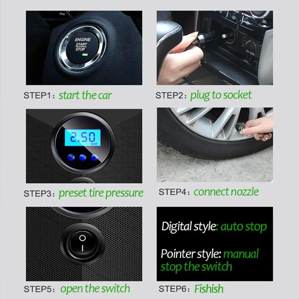 1. Простота в использовании: Просто Подключите гнездо, подключите шланг к шине, а затем включите машину до тех пор, пока надуватель автомобильных шин не закроется автоматически.