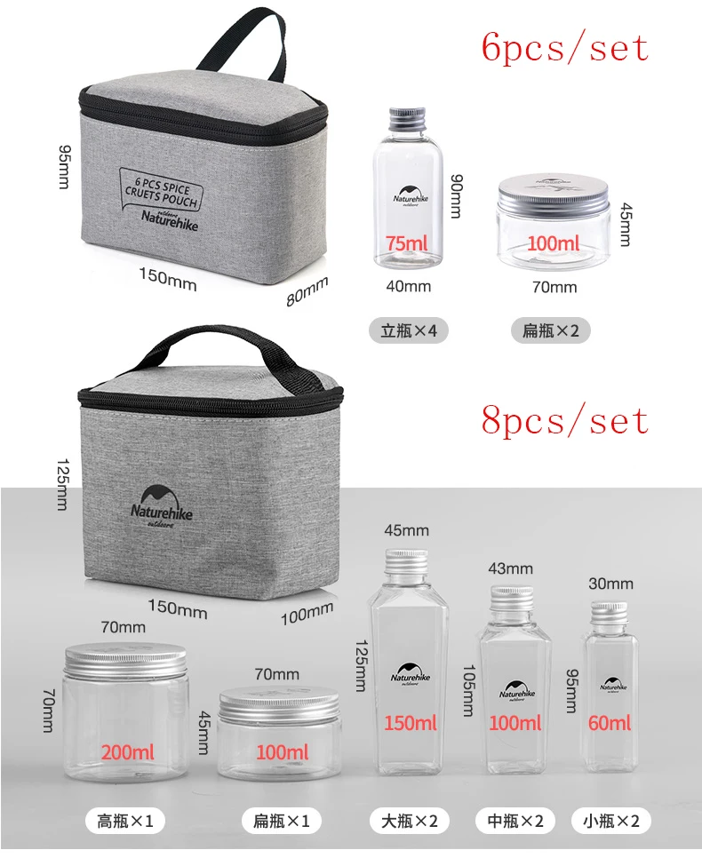 Naturehike бутылки для приправ банки с сумкойБренд: NaturehikeМодель: NH17T011-P/ NH19T002-PМатериал мешка для хранения: катион 300D + полиэфир ПВХМатериал банок для бутылок: ПЭТ + алюминиевая крышкаЦвет: серая сумка для храненияДля: пикника для барбекю на открытом воздухеПосылкаМаленький: 1 сумка для хранения + 2 банки + 4 бутылкиБольшой: 1 сумка для хранения + 2 банки + 6 бутылок