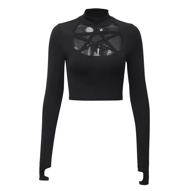 Футболка в стиле панк, гранж, Готическая футболка в стиле Харадзюку, Сетчатая футболка с длинным рукавом и пентаграммой, осенняя Винтажная футболка в стиле пэчворк с вырезами