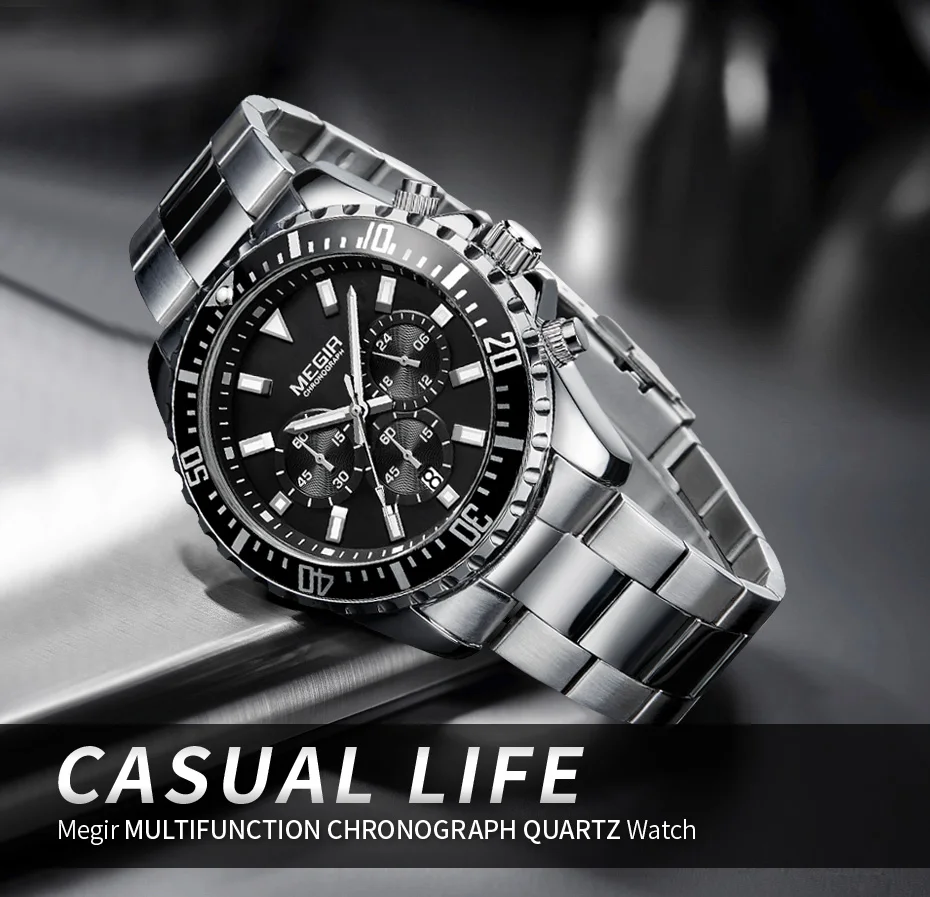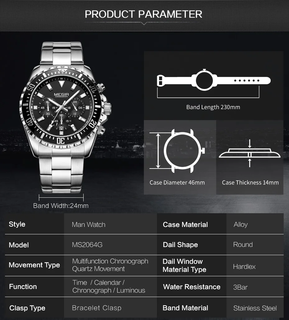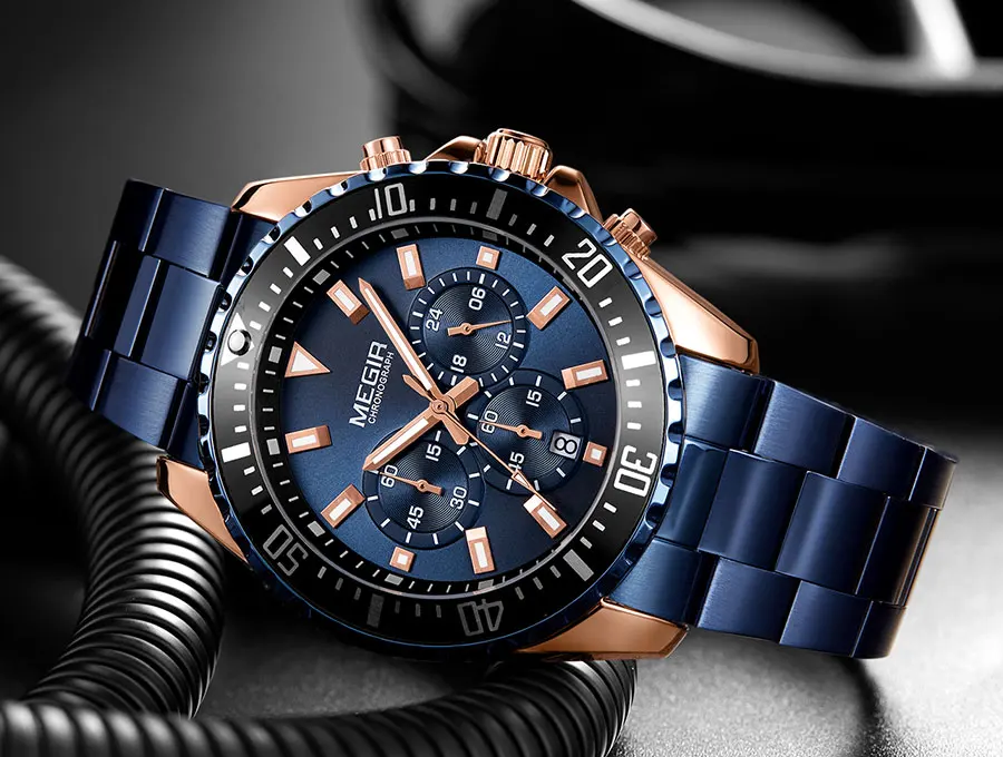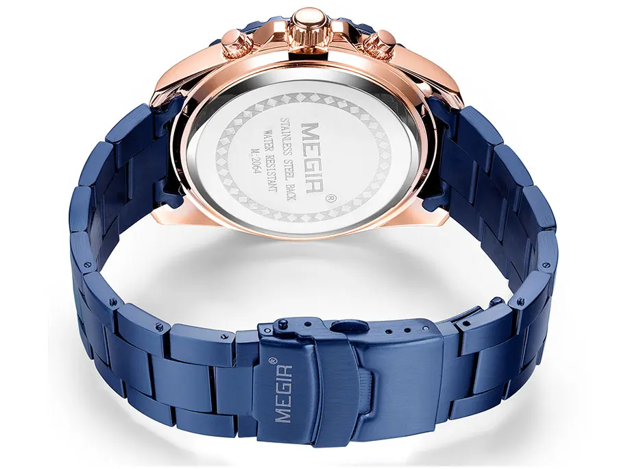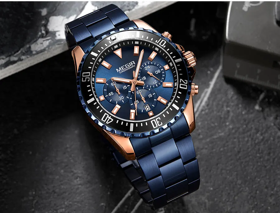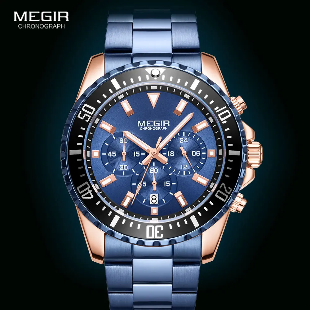 Часы MEGIR мужские кварцевые с хронографом, светящиеся синие наручные, с ремешком из нержавеющей стали