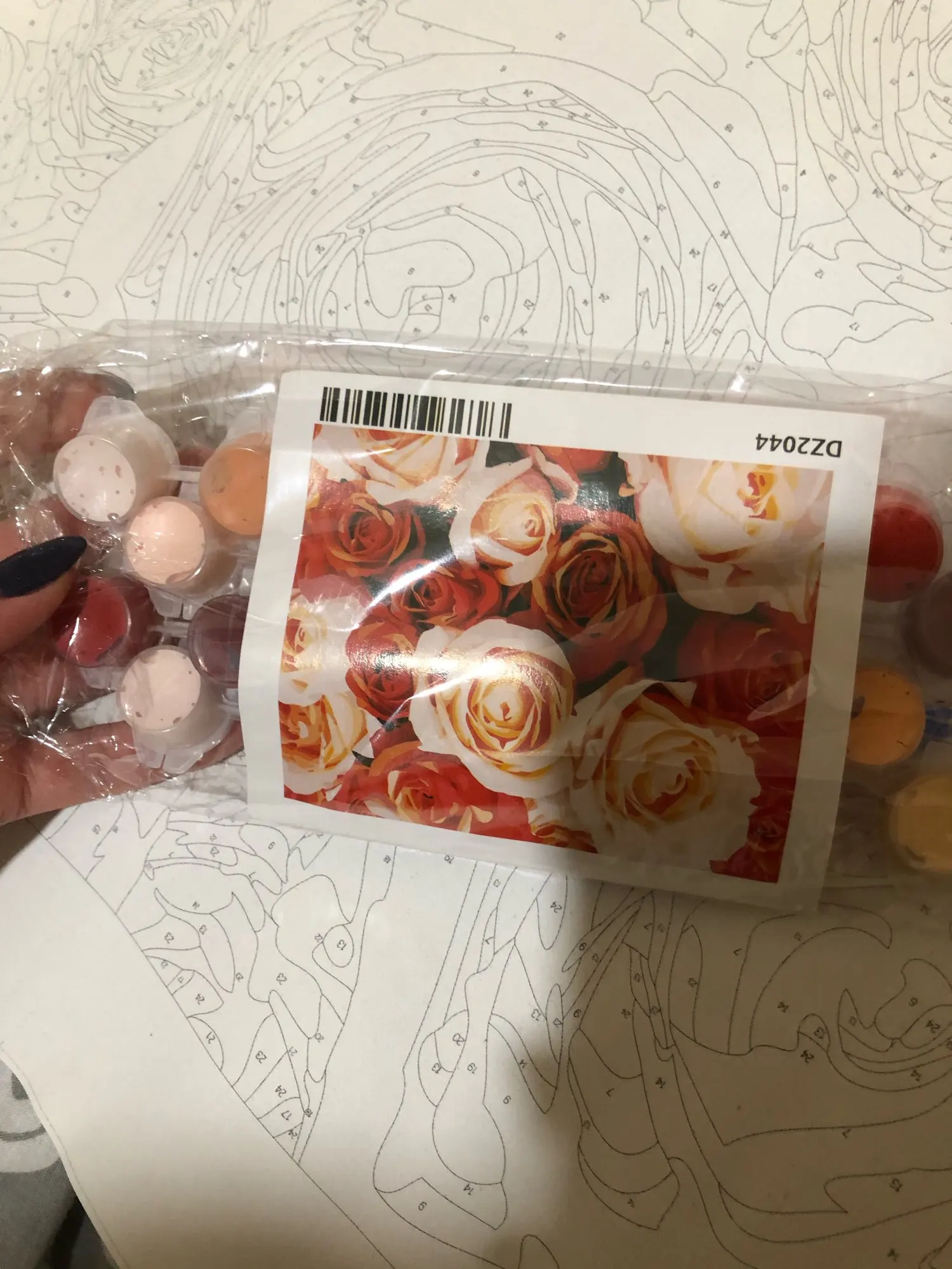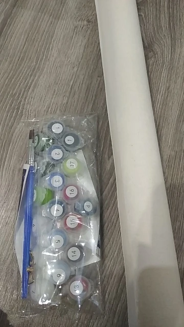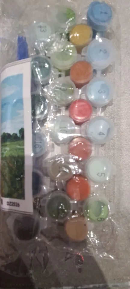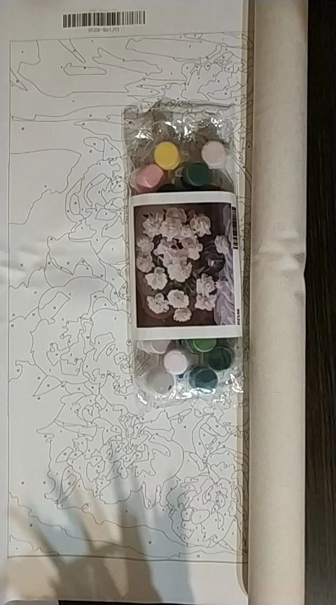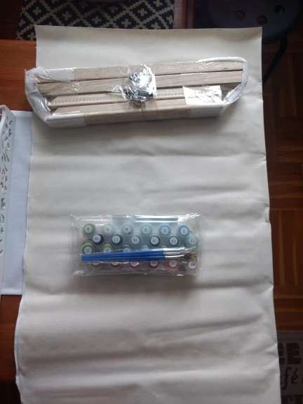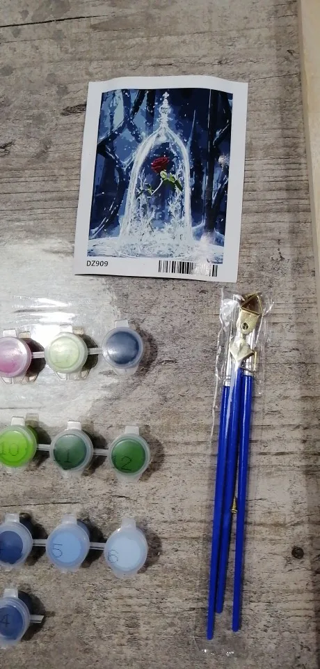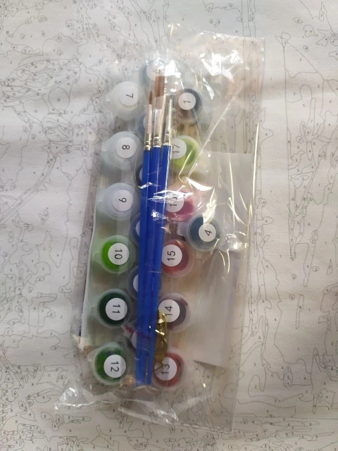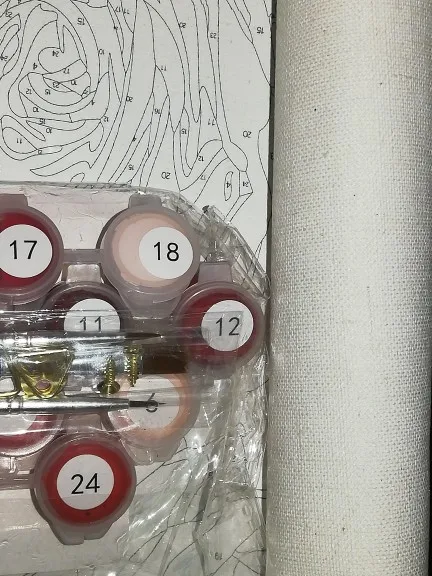 1 Набор DIY frame,1 набор thumbtack, 1 * льняной холст, 1 набор акриловой краски, 3 * нейлоновые кисти, вешалки, pdf reference, руководство по цвету, посылка: свернутый холст с воздушным пузырьком