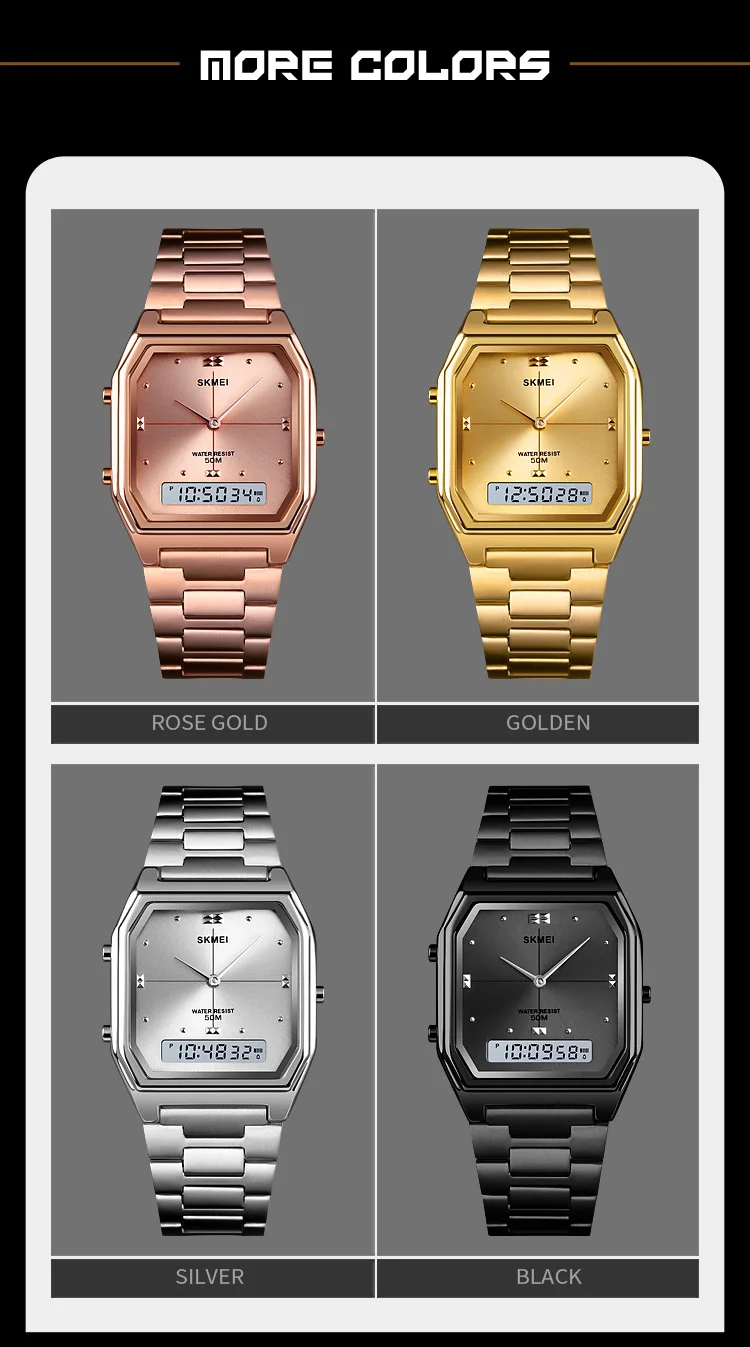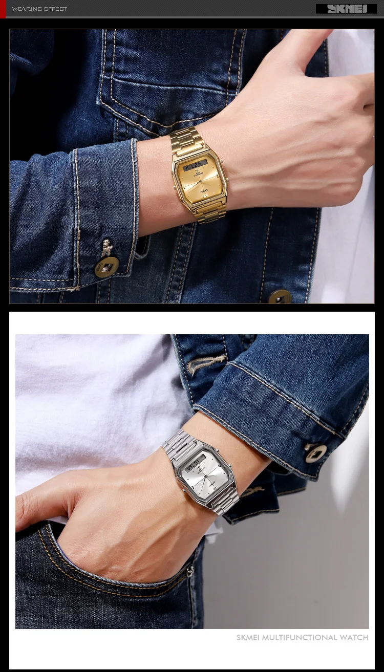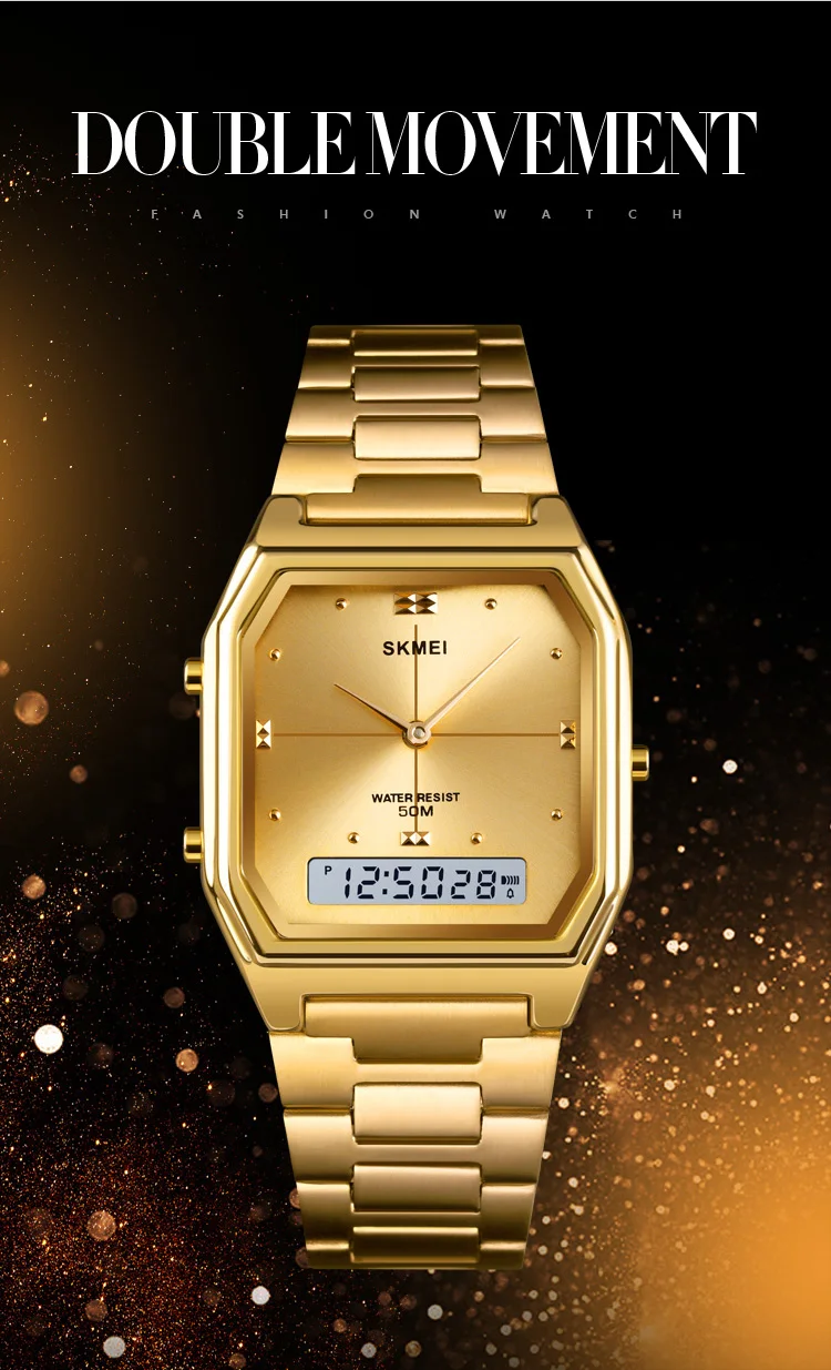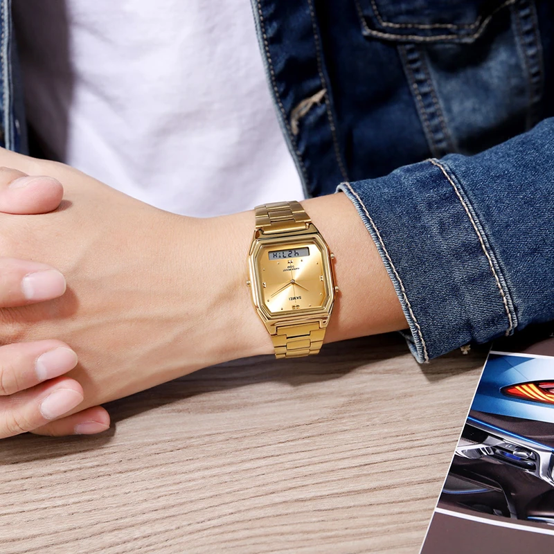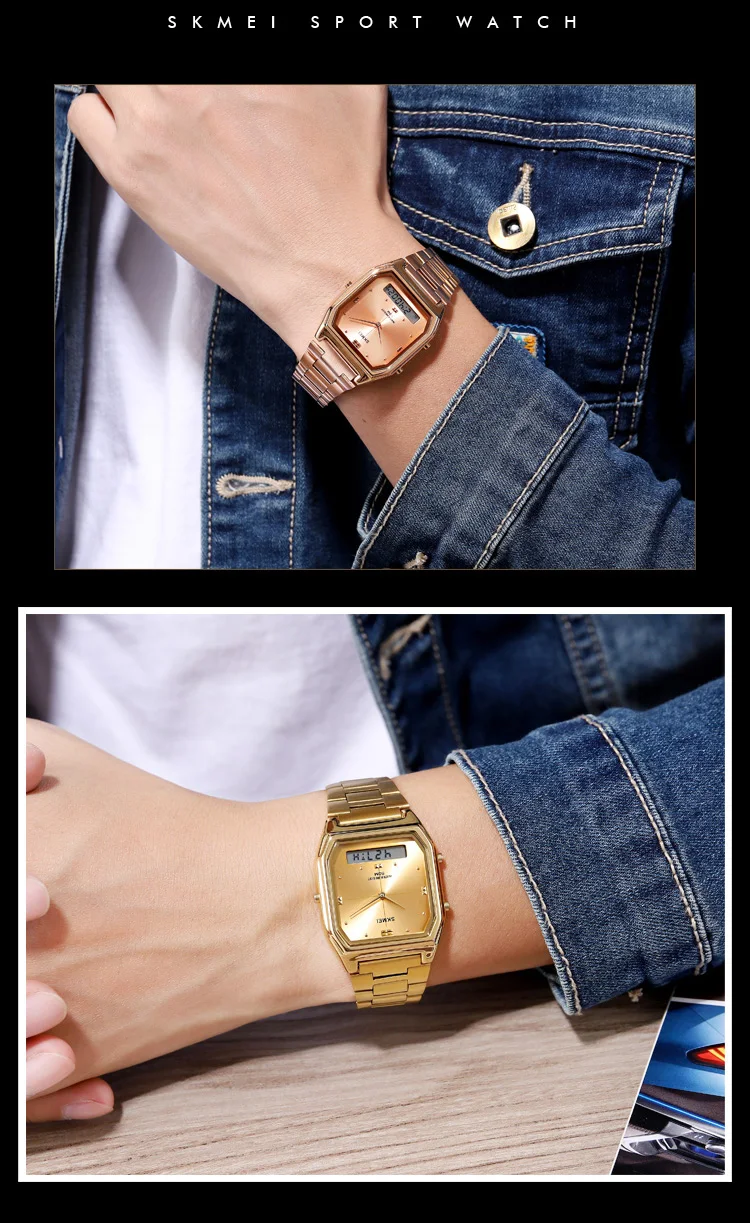 Часы наручные SKMEI мужские с двойным дисплеем, Модные Роскошные Аналоговые с хронографом из нержавеющей стали золотого цвета, 3 раза, 1612