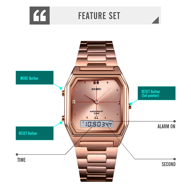 Материал корпуса: цинковый сплавЧехол Диаметр: 32 ммЧехол Толщина: 9 ммМеханизм: двойной дисплейМатериал ремешка: нержавеющая стальДлина ремешка (включая чехол): 230 ммШирина ремешка: 15 ммВодонепроницаемость: 50 мВес нетто часов: 55 гФункция: 3 раза, хронограф, будильник, неделя, дата, 12/24 часов, хронограф