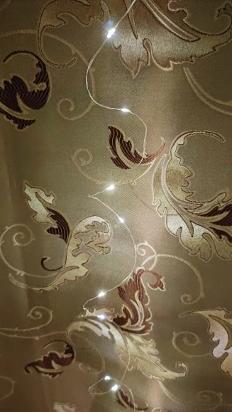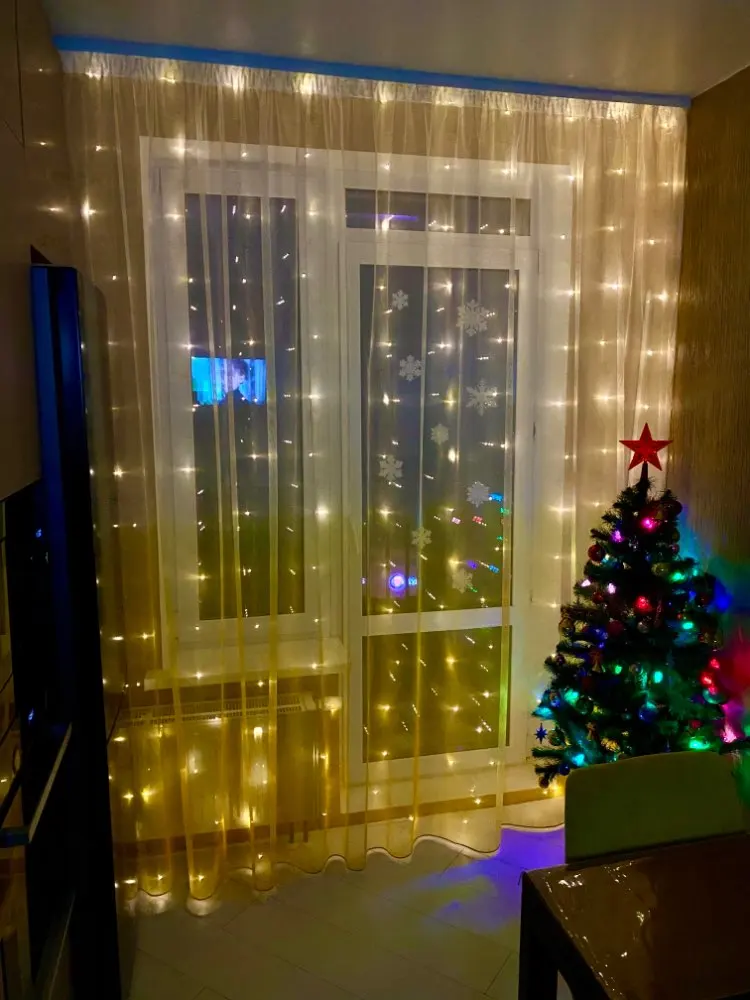 Выглядит очень красиво и сказочно. Из минусов - стреляется током, металлические нитки могут запутаться в собранном виде, и есть пара режимов миганий, которые могут вызывать эпилепсию. Пультом не пользовались (нет батарейки в комплекте). USB шнур захотел работать только с айфоновской вилкой. Ещё кошке понравилось, сгрызла все нижние огоньки, так что гирлянда не болтается по полу. Очень порадовала быстрая доставка, к НГ успели)