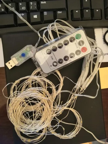 Герлянда кажется хрупкой. Так что стоит быть оккуратно. И это просто обычные светодиоды. Присмотритесь внимательно, подумайте надо ли вам это. А потом заказывайте. Пультик не работает, но этот вопрос с продавцом мы решили сразу. За это большой плюс.