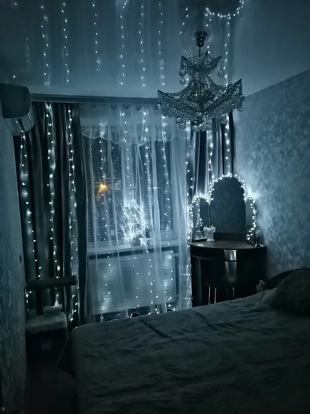 Очешуительная гирлянда. Размер вроде соответствует. Несколько режимов мерцания. Брала в зал, но теперь хочу и к себе в спальню - для создания праздничного настроения. Надеюсь, что прослужит долго.