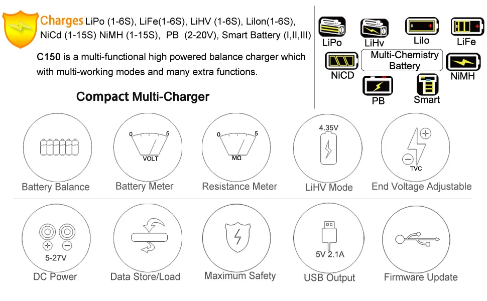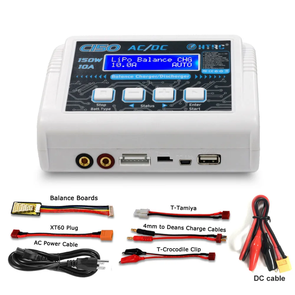 C150-это многофункциональное зарядное устройство HTRC, Экономичная цена, высокое качество. С использованием 2x16 светодиодных дисплеев, встроенного вентилятора охлаждения, постоянного тока 11-18 в или 100-240 В переменного тока двойной мощности. Максимальная мощность зарядного устройства 150 Вт, максимальный ток зарядки 10 А. Предназначен для зарядки аккумуляторов LiPo LiFe Lilon LiHV NiCd NiMh Pb Smart.Кроме того, он имеет выходной порт 5 В 2.1A USB DC, который может быть источником питания для других электронных продуктов.Особенности:* Компактное зарядное устройство, легко носить с собой, прост в использовании.* Практичный для различных батарей.* Автоматическая идентификация аккумуляторные ячейки Li-Po* Встроенный вентилятор для легкого рассеивания тепла* Несколько режимов зарядки.-Lipo/Lilo/LiFe/LiHv: баланс заряда, заряда, быстрой зарядки, хранения, разрядки.-NiMH/NiCd: зарядка, разрядка, цикл.-PB: зарядка, разрядка, струйка.* Многофункциональная функция:-Измеритель заряда батареи: отображение Количества ячеек литиевой батареи, общего напряжения, процент емкости батареи, Напряжение каждой ячейки.(Не поддерживает батарею 1s)-TVC (контроль напряжения терминала): зарядное устройство позволяет пользователю устанавливать конечное напряжение зарядки/разряда.-Проверка внутреннего сопротивления литиевой батареи: может отображать сопротивление каждой ячейки.(Не поддерживает батарею 1s)-Балансировка: индивидуальная балансировка напряжения, мониторинг напряжения-Умная Батарея: умная батарея I,II,III и цифровая мощность постоянного тока. (Нужен дополнительный зарядный кабель DJI)* Usb-порт 5 в 2,1 А.* Хранение и загрузка данных* Батарея ломается и катается на велосипеде.* Максимальная безопасность: автоматический лимит заряда, Дельта-пиковая чувствительность, ограничение емкости, ограничение времени обработки, порог температуры.* Встроенный PFC* Обновление прошивки.Спецификация:Номер модели: HT-0097Вход: AC 100-240 В/DC 11-18 вМощность зарядки: макс. 150 ВтМощность разряда: 10 ВтДиапазон заряда: 0,1-10AДиапазон тока разряда: 0,1-2ALilon/LiPo/LiFe/LiHV Количество ячеек: 1-6 ячеекNiCd/NiMH Количество ячеек батареи: 1-15 ячеекPB Напряжение батареи: 2-20 вУмная Батарея: I/II/IIIСлив тока для балансировки: 500 мА/ячейкаВес нетто: 0,48 кгРазмер: 145*105*64 ммВес брутто: 0,8 кгРазмер посылка: 215*155*75 мм
