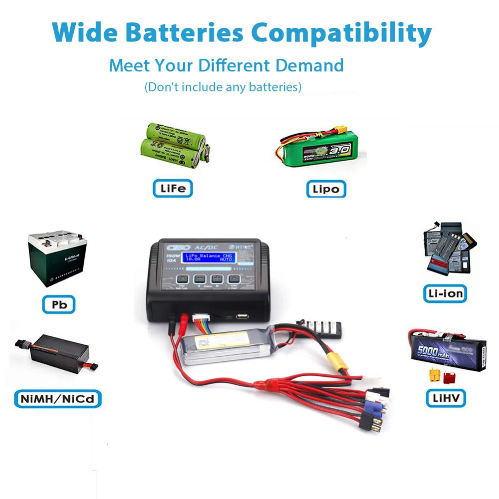 Посылка:1x зарядное устройство C1501x зарядный кабель (разъем типа «банан» к 8 разъемам)1x XT60 для кабеля с зажимом типа «крокодил»1x балансировочная плата с контактным шнуром1x шнур переменного тока (США, ЕС, Великобритания, AU Спецификация опционально)1x Руководство пользователя