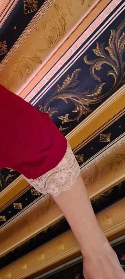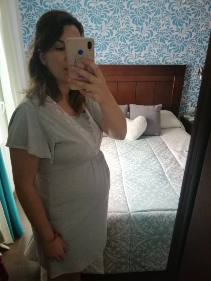 Я измерил 177 см, надел в это время 40/42 и в настоящее время беременна 6/7 месяцев: я заказал размер L. Это довольно мягкий материал. Я ожидал, что сделано в Китае не ужасно, но я был очень удивлен. Я кладу его в сумку для беременных. Наденьте топ на бретелях или ночнушку, она элегантная. Я думаю, что я должен был взять размер выше для большего количества помех в руке, но это не стыдно.
