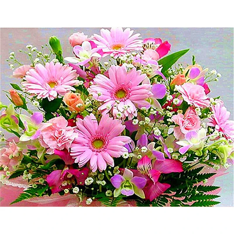 5D DIY камни в форме ромбаНабор для рисования с круглыми камнями и полотном Картина Букет цветов Алмазная вышивка в виде ромашек Стразы картина, Алмазная мозаика подарок