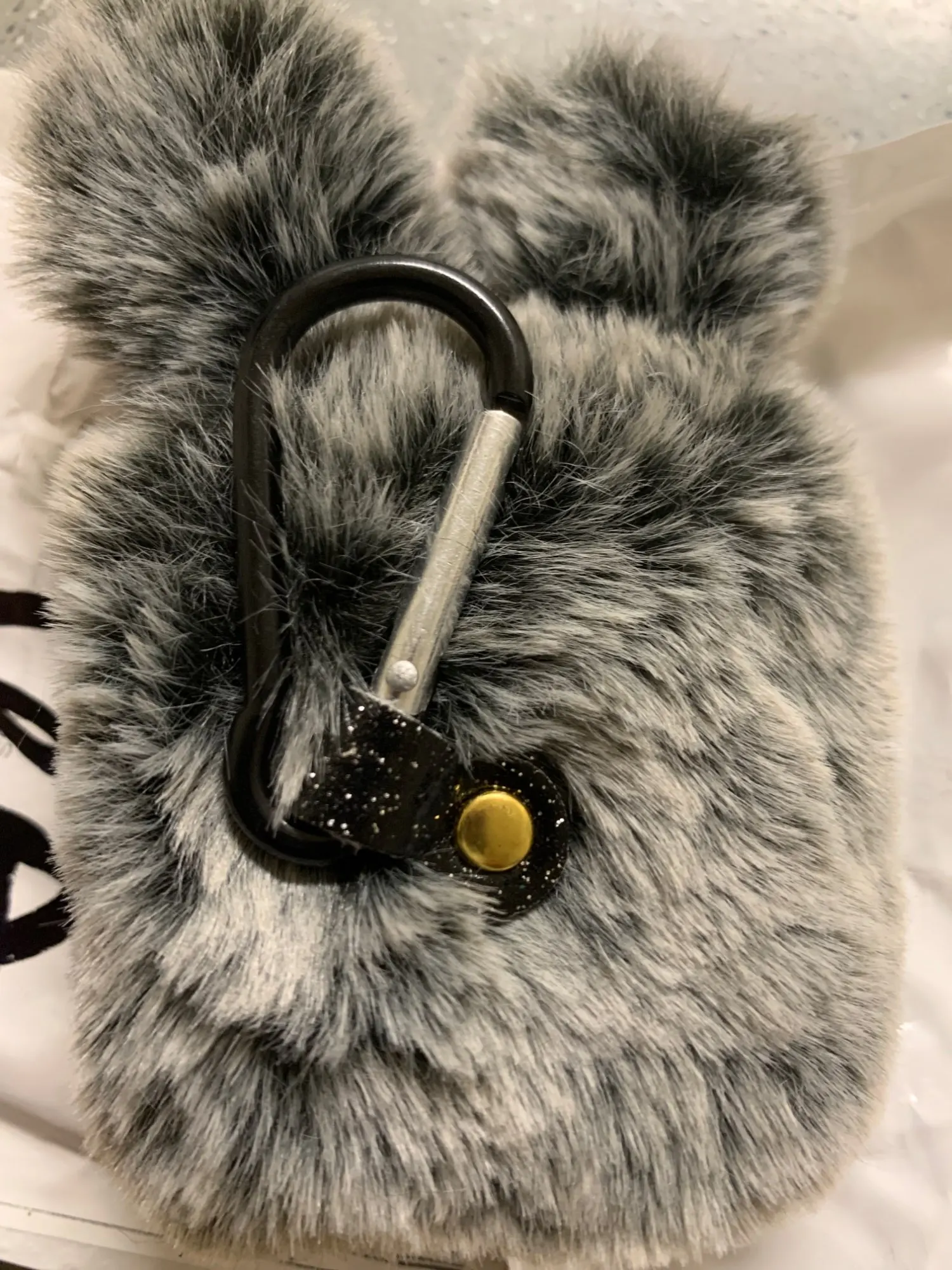 Очень пушистый и милый. Имеет блестящую вещь с золотой кнопкой на спине, поэтому она открывается и закрывается, работает как обычный случай, он милый в хорошем состоянии и соответствует описанию.