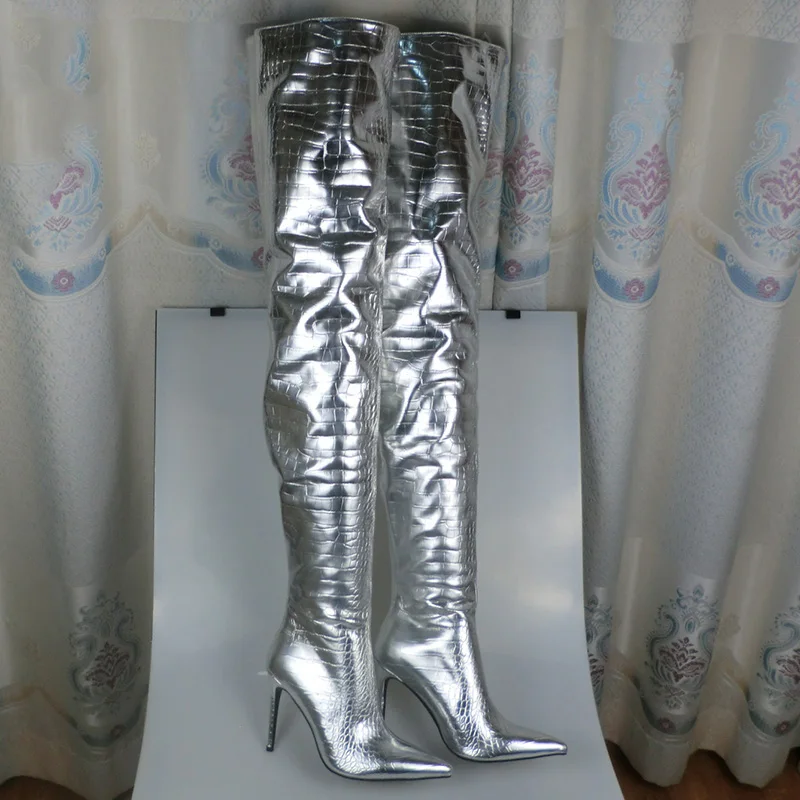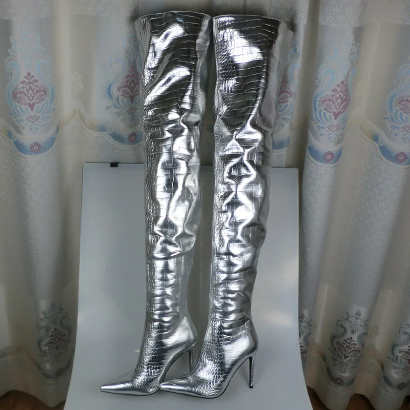 Olomm2020 г. Женские сапоги до бедра сапоги на высоком каблуке-шпильке пикантная Серебристая Клубная обувь с острым носком женская обувь, размер США 5-15