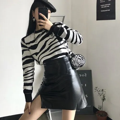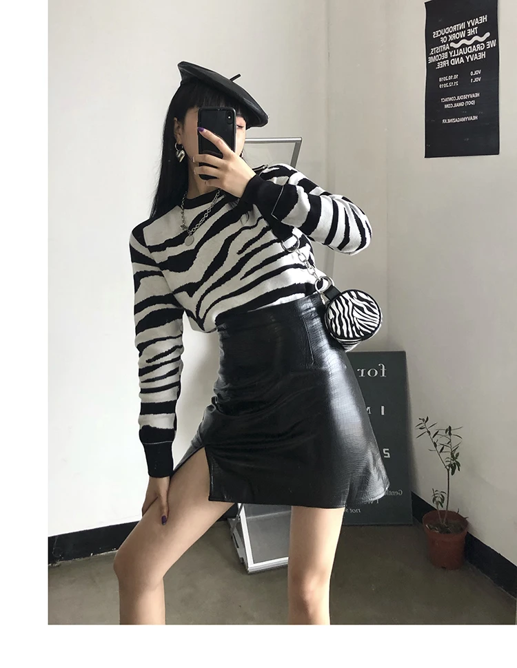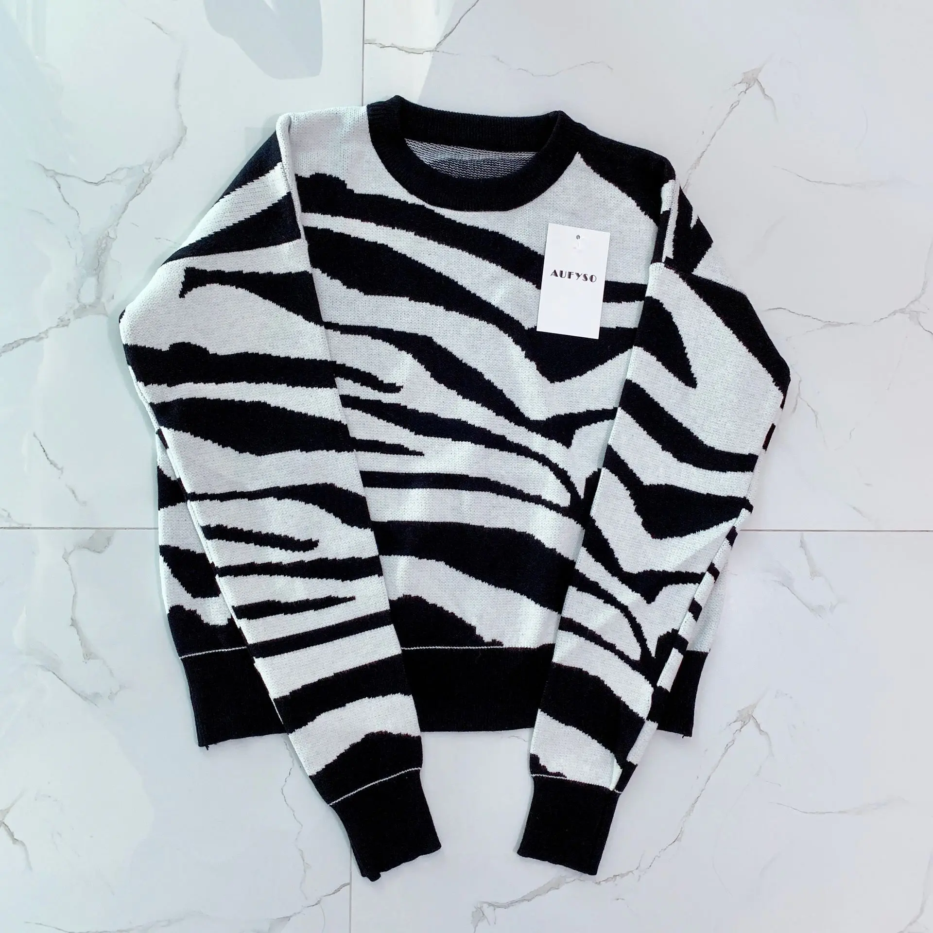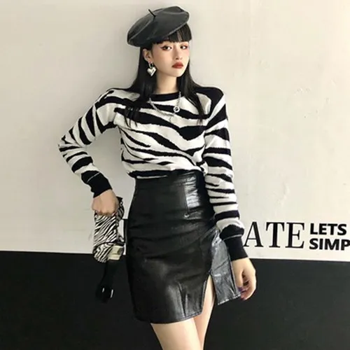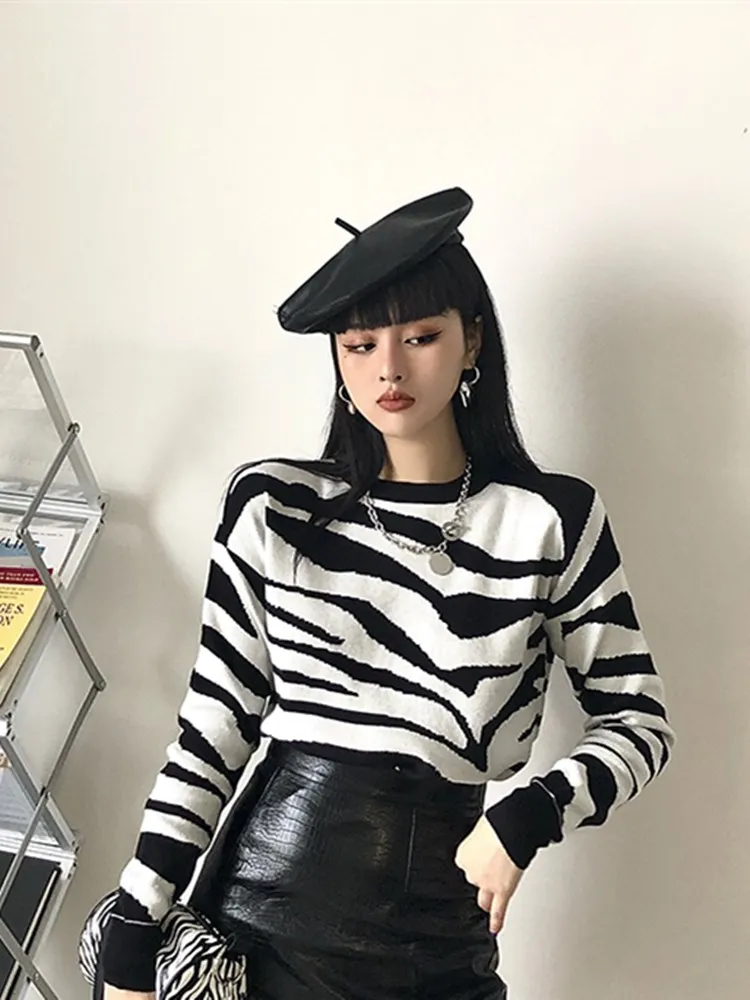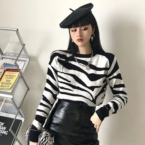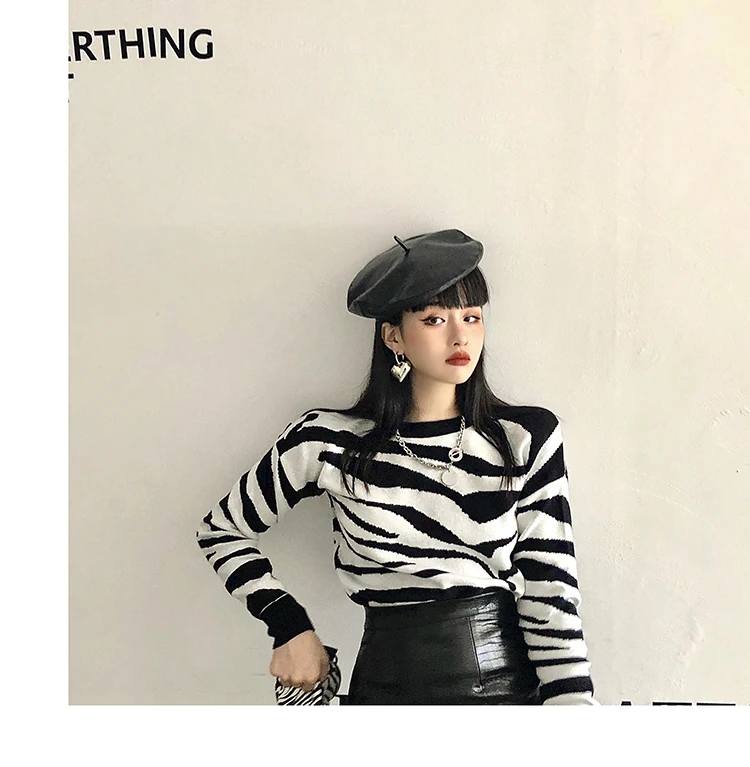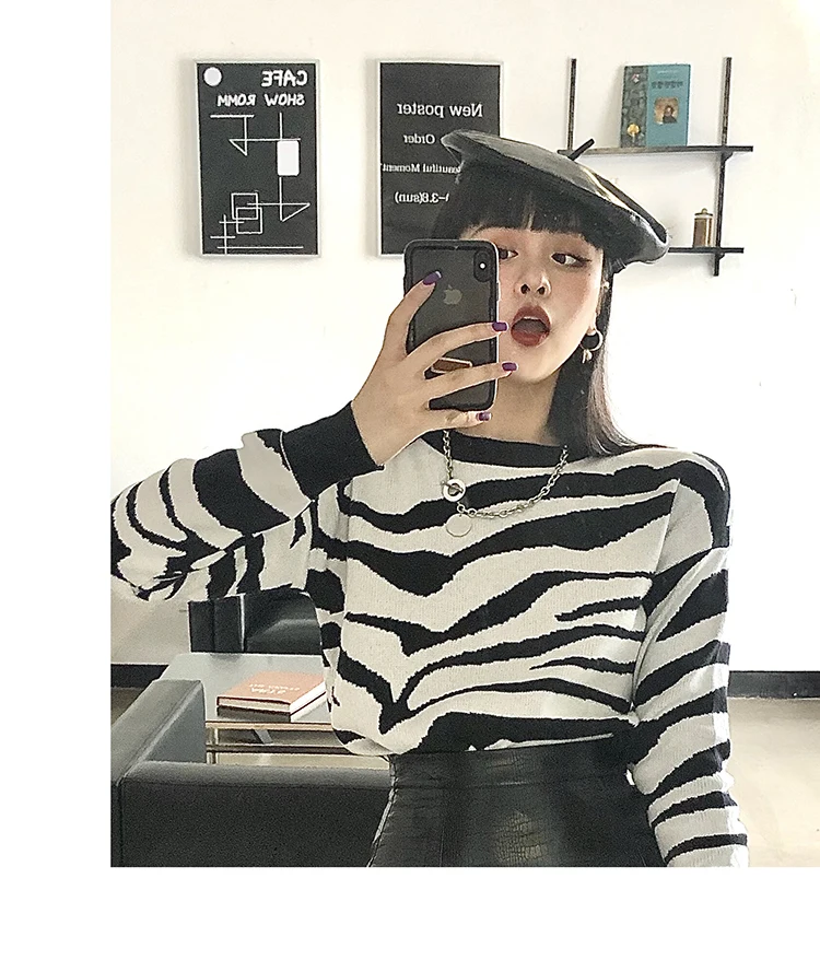 Корейский модный джемпер для женщин осень 2020 Винтаж Зебра полосатый круглый вырез длинный рукав вязаный свитер пуловер трикотажная одежда топы T556