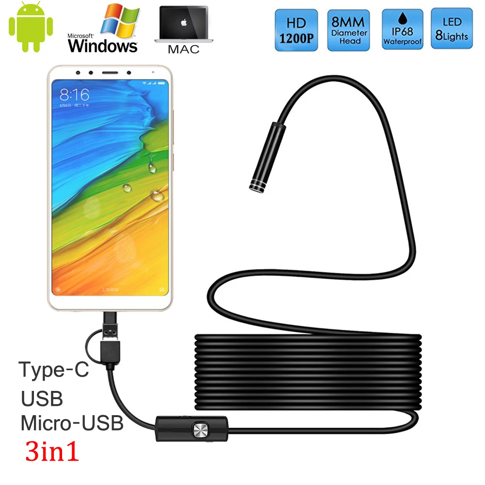 Особенности:Водонепроницаемый уровень IP68, вам не придется беспокоиться о повреждении воды.Длина длинного кабеля, 4 вида длины на выбор.1200P HD камера, прозрачная и простая в установке и использовании.С 6 белых регулируемых светодиодный свет, приятного дизайна.С тремя видами usb-порта: Micro USB, Type-c и USB.