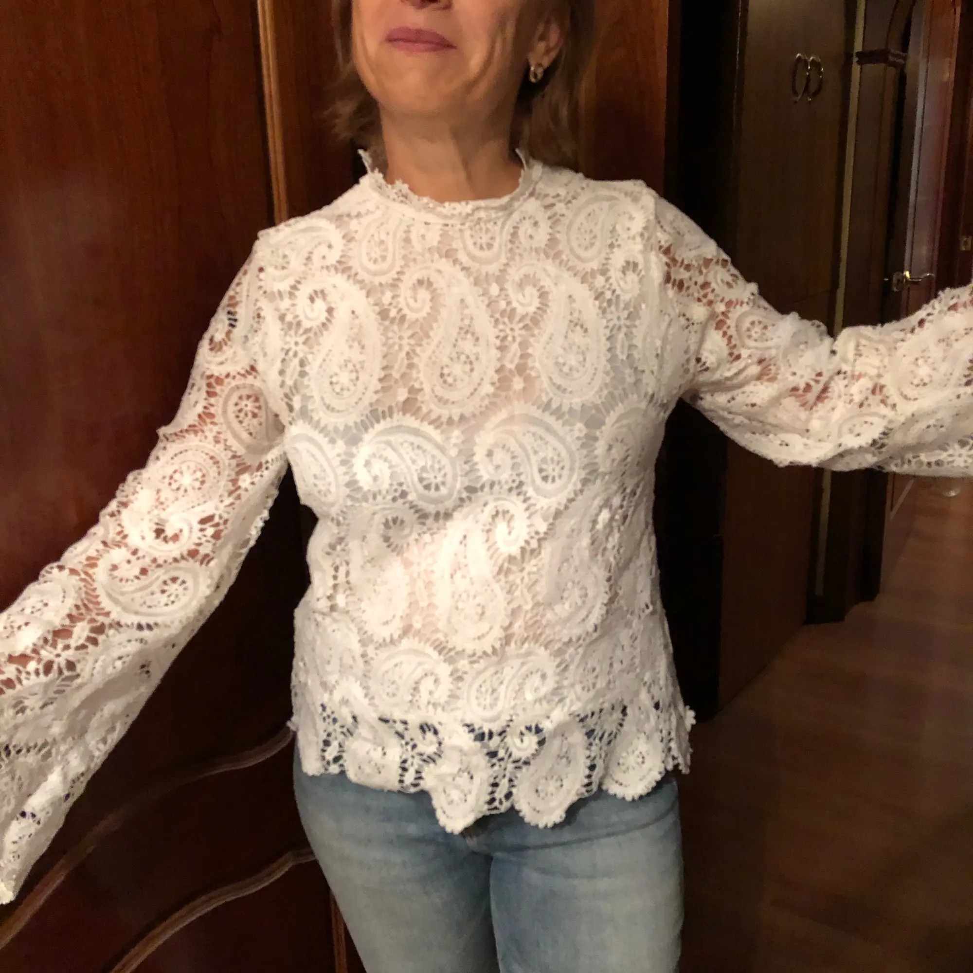 На свой 44-46 взяла М, можно было и L брать. Прям впритык. Хотелось бы по свободнее и длинней. Очень тоненький ниточки кружева, хотя сами кружева очень красивые. Странные рукава. Непонятные ленточки.... Лучше без них, просто расширенный рукав носить.
