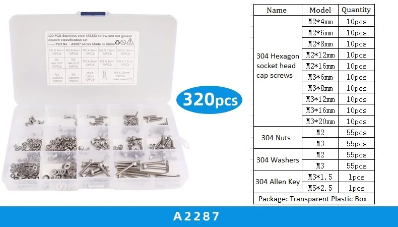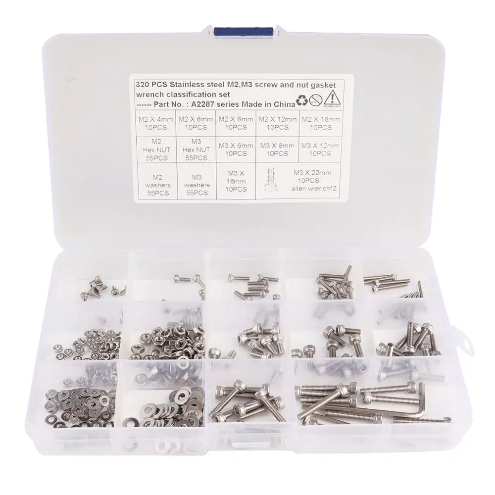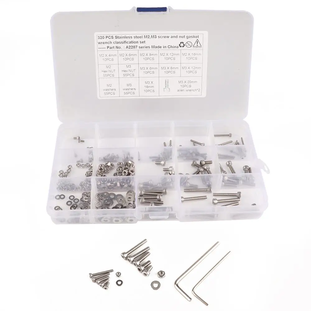 320 шт.лот M2M3 304 Шестигранная головка из нержавеющей стали с шестигранной головкой, винты с шестигранной головкой, гайки и шайбы, набор винтов с шестигранным ключом