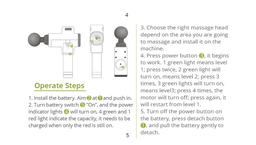 1. Включает 4 различных массажных головки, удовлетворяющие различные требования. 2. Эффективно уменьшает мышечную жесткость и боль, увеличивая кровообращение. 3. 3-скоростная регулировка, вы можете выбрать, что вам подходит. 4. 10 минут интеллигентая (ый) сроки гарантирует долгий срок службы. 5. 1500mha большая емкость литиевая батарея. 6. Защита от перегрева, защита, защита от перегрева и другие устройства защиты безопасности, безопасен в эксплуатации. 7. Подходит для восстановления после спортивных усталость, реабилитации после спортивных травм, боли Рельеф во время восстановительный период хирургического вмешательства, а также снижения воспаления Реакции.
