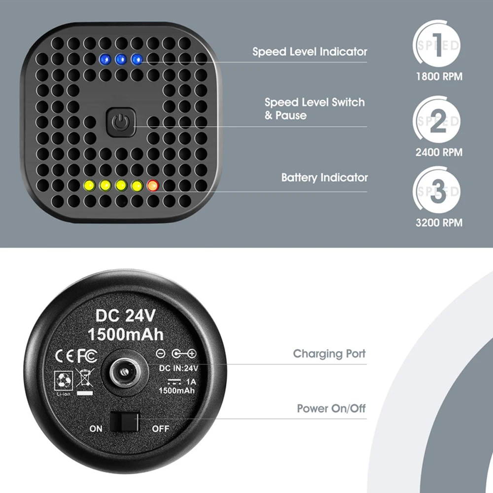 Мощность Зарядное устройство -- Расклассифицированный Входной сигнал: 100 ~ 240V 50/60Hz 1A Батарея -Номинальное напряжение: 24 В постоянного тока -- Тип: литий-ионный аккумулятор -- Ёмкость: 1500 мА-ч -- Час работы: 4-6 часов Массажер -- Скорость без нагрузки: 3000 об/мин -- Вес: 1,5 кг -Размерный ряд: 25x23cm -- 3 уровня регулировки: Уровень 1 - 1800/мин, уровень 2 - 2400/мин, 3 уровня-3200r/мин