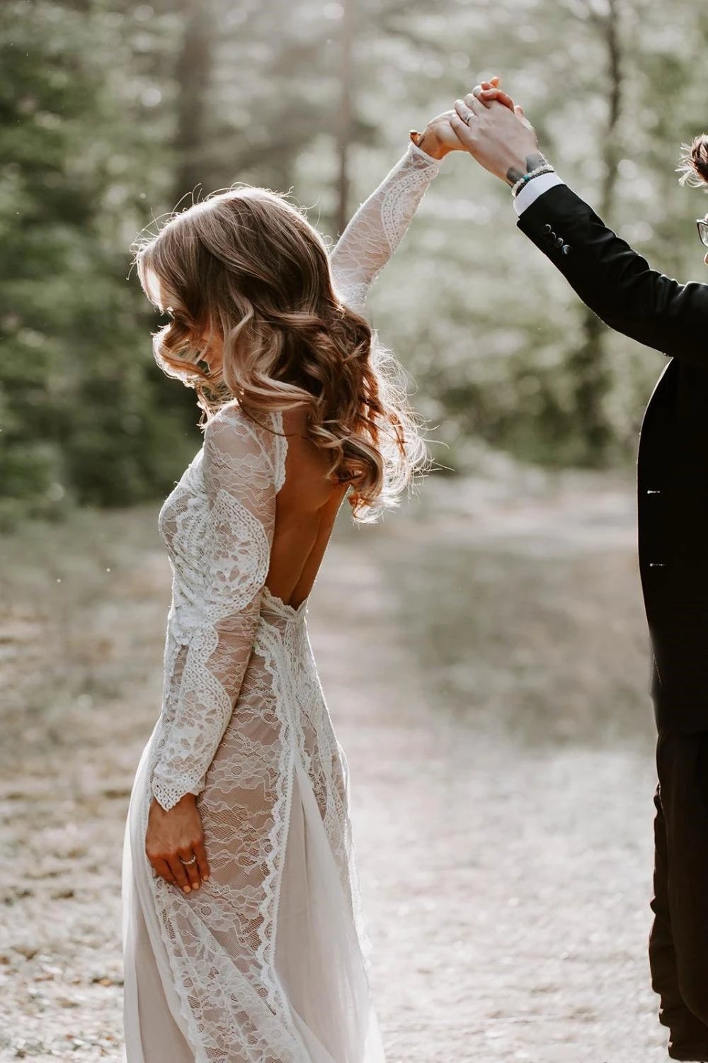Романтичное французское кружевное свадебное платье-русалка, длинные сексуальные платья с открытой спиной и длинным рукавом в богемном стиле, пляжные свадебные платья с иллюзией в стиле бохо, новинка 2021