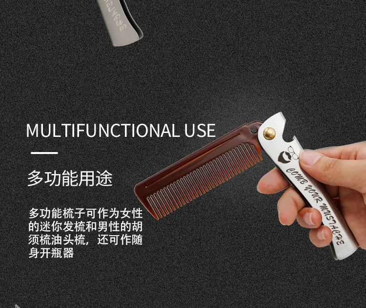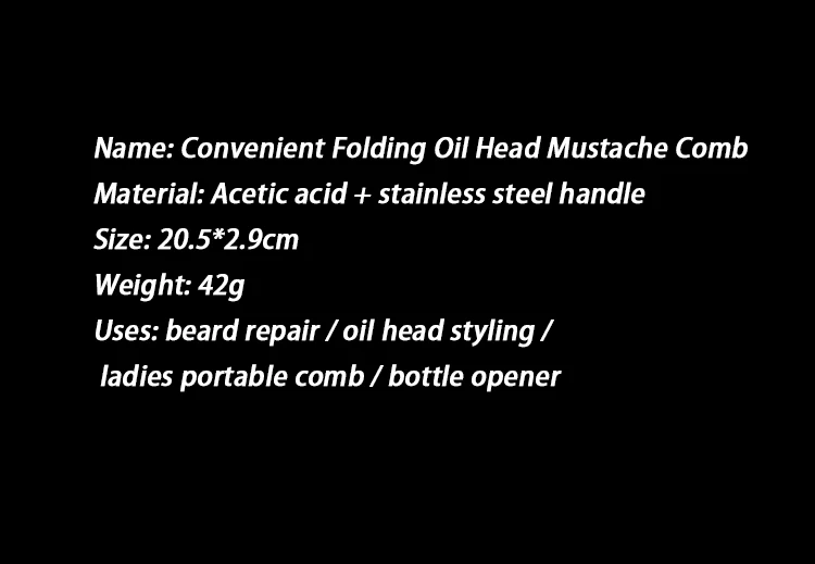 Наименование: удобная складная масляная голова, расческа для усов Материал: ручка из нержавеющей стали с уксусной кислотой Размеры: 20,5*2,9 см Вес: 42 г Применение: ремонт бороды/масляная голова для укладки/Дамская портативная Расческа/открывалка для бутылок