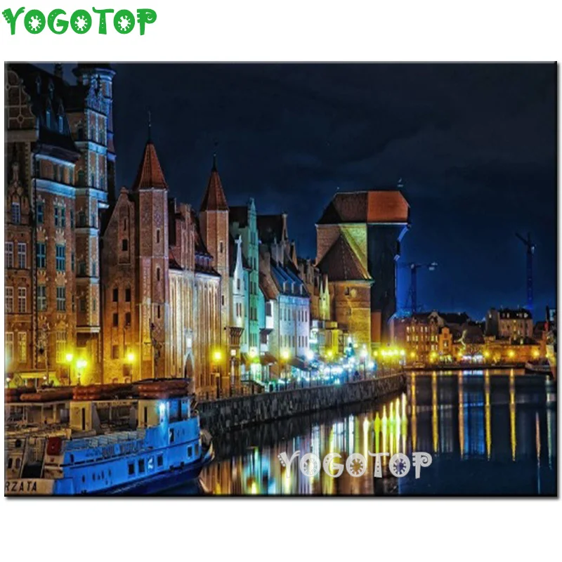 5d алмазная живопись, полностью польские дома, реки, Гданьск, ночные уличные фонари, Алмазная мозаика, алмазная вышивка, стразы YY4644