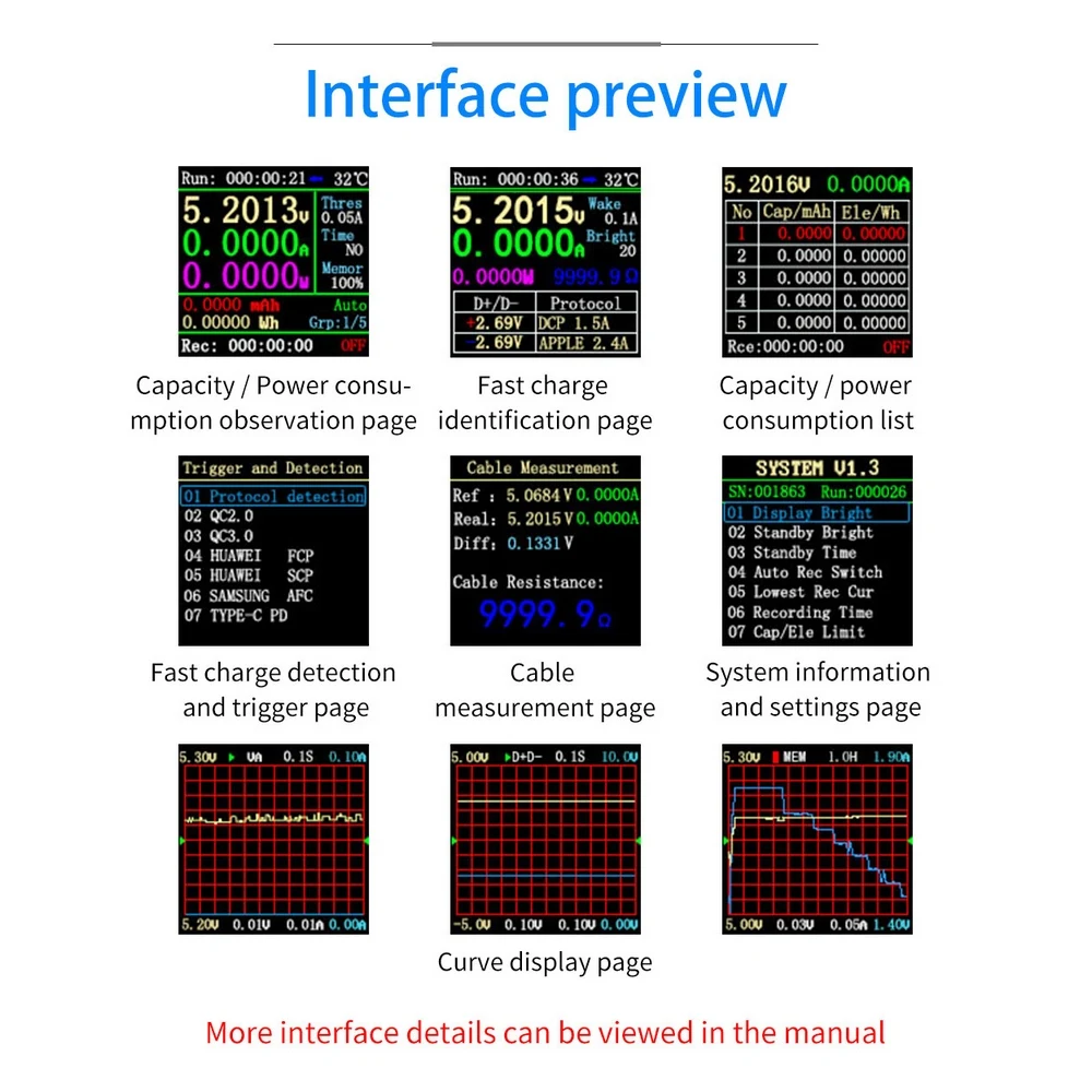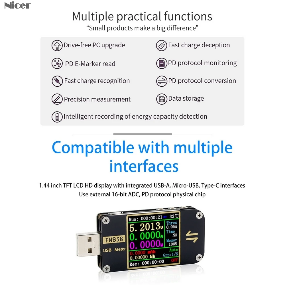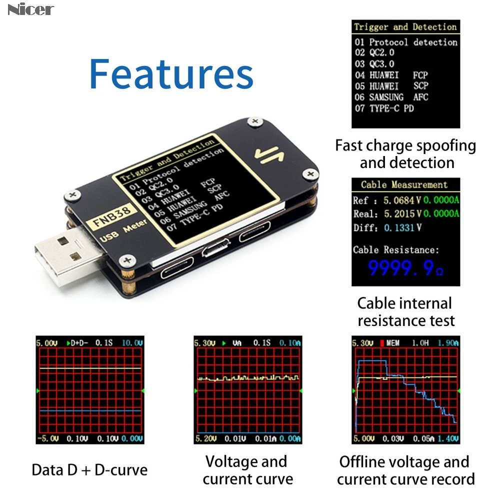 • Это USB-тестер с высокой надежностью и безопасностью для обнаружения напряжения и тока USB, а также триггеров быстрой зарядки мобильного терминала связи. • Интерфейс USB 2,0, 1,44 дюймовый TFT LCD дисплей высокой четкости с интегрированным USB-A, Micro-USB, интерфейсами Type-C, используйте внешний 16-битный ADC, физический чип протокола PD. • Обновление ПК без накопителя, чтение электронных маркеров PD, быстрое распознавание заряда, быстрый обман заряда. • Мониторинг протоколов PD, преобразование протоколов PD, точное измерение. • Хранение данных, интеллектуальная запись обнаружения энергоемкости. • Один экран, Совместимость с несколькими интерфейсами. • Может использоваться для обнаружения протокола быстрой зарядки, триггера QC2.0, триггера QC3.0, триггера Huawei-FCP, триггера Huawei-SCP, триггера Samsung-AFC, триггер протокола PD и так далее.