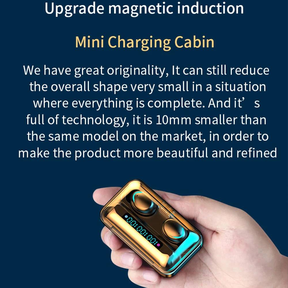 TWS-наушники F9 с поддержкой Bluetooth 5,0 и отпечатком пальца Характеристики: Название продукта: Bluetooth-наушники F9 TWS Версия, совместимая с Bluetooth: 5,0 Интеллектуальное шумоподавление: Поддержка Расстояние, совместимое с Bluetooth: около 10 м Автоматический ботинок/пара: Поддержка Функция Powerbank: Поддержка Водонепроницаемость и защита от пота: Поддержка Режим работы: сенсорный Метод работы: Воспроизведение/пауза светильник одним нажатием наушника Ответ/положить трубку: Зажгите наушник один раз Звоните Siri: Нажмите и удерживайте Левый наушник или 1 секунду Уменьшение громкости: Коснитесь левых наушников 3 раза Переключите предыдущую песню: дважды коснитесь левого наушника Выключение/включение: Нажмите и удерживайте наушники в течение 5 секунд Способ зарядки: Зарядка наушников: Положите наушник в зарядный чехол и закройте крышку. Наушники будут автоматически заряжаться. Наушник светильник рается красным при зарядке и выключается при полной зарядке Футляр для наушников зарядки: после соединения кабеля засветильник красный светильник в зарядном футляре, а красный светильник гаснет при полной зарядке Комплектация: Наушники 2 × 1 × чехол для зарядки 1 × зарядный кабель 1 × руководство пользователя 4 × наушники