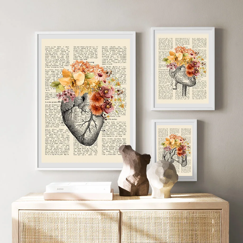 Винтажная газета, сердце, мозг, анатомия, настенное искусство, холст, живопись, скандинавские плакаты и принты, настенные картины для декора гостиной