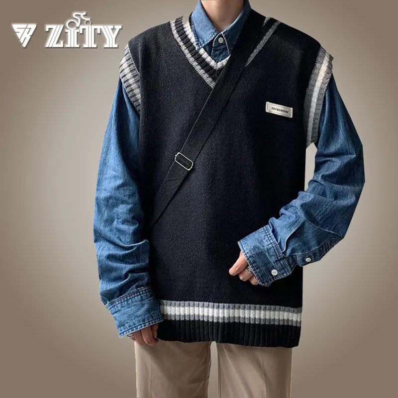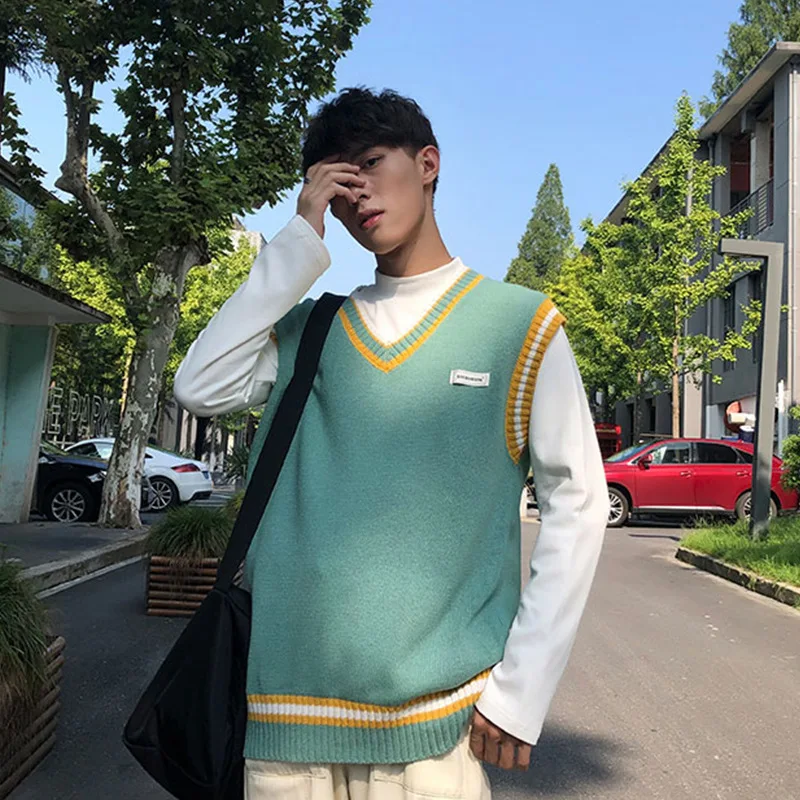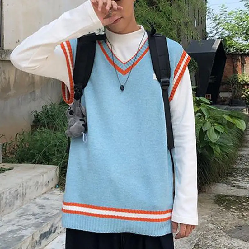 Вязаная жилетка с Для мужчин s v-образным вырезом Harajuku жилеты Для мужчин корейский стиль Лоскутные пары вязаный свитер без рукавов, мужской Повседневное пуловеры